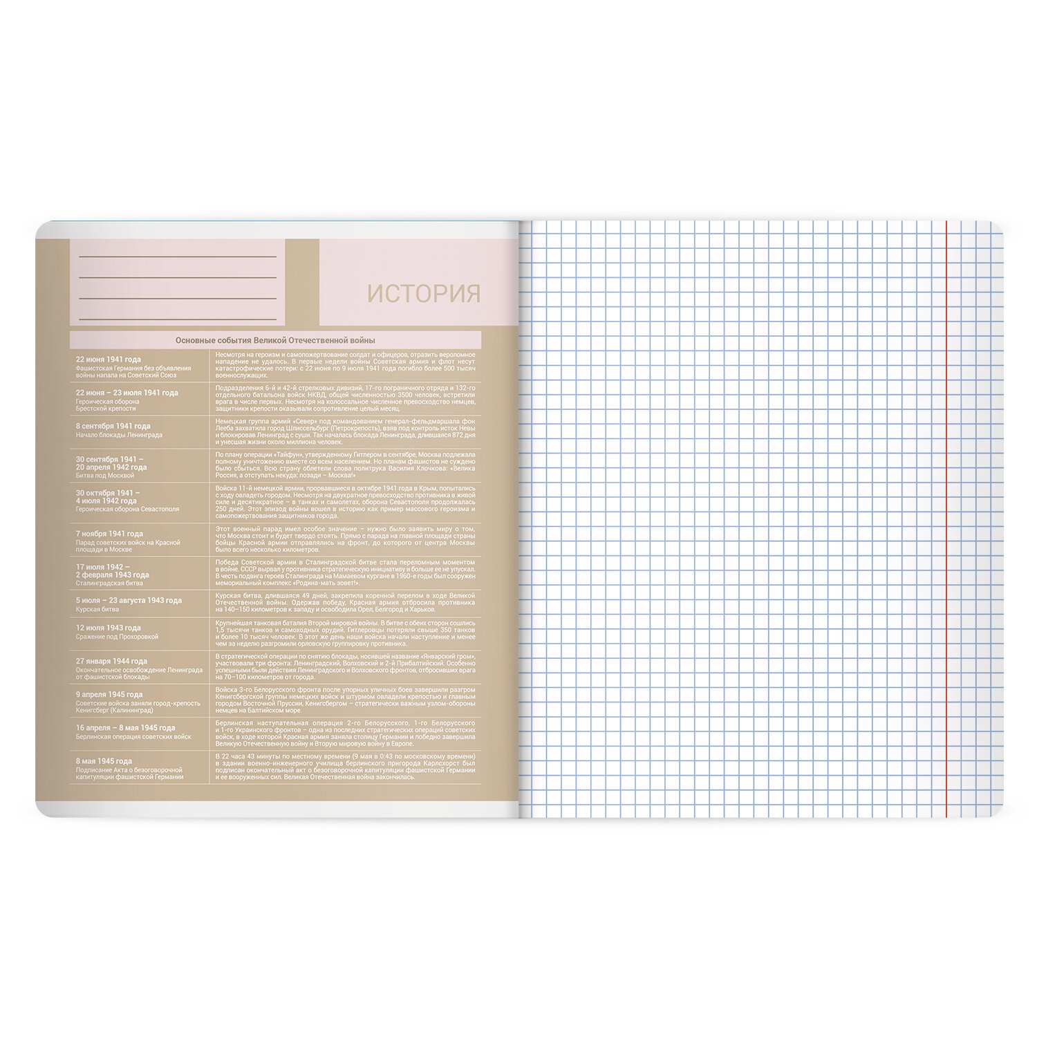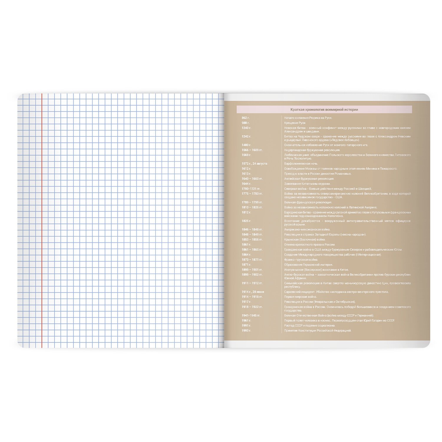 Тетрадь по истории формата А5 с двойной обложкой: внешняя выполнена из высококачественного износостойкого прозрачного пластика, внутренняя – из качественной офсетной бумаги. Преимущество таких тетрадей заключается в том, что для сохранения внешнего вида не нужно покупать дополнительную обложку. На подкладных листах содержится справочный материал по предмету. Внутренний блок плотностью 60 г/м2 из офсетной бумаги содержит 48 листов в клетку с полями. Белизна блока - 100%. Скрепка надежно соединяет листы между собой.