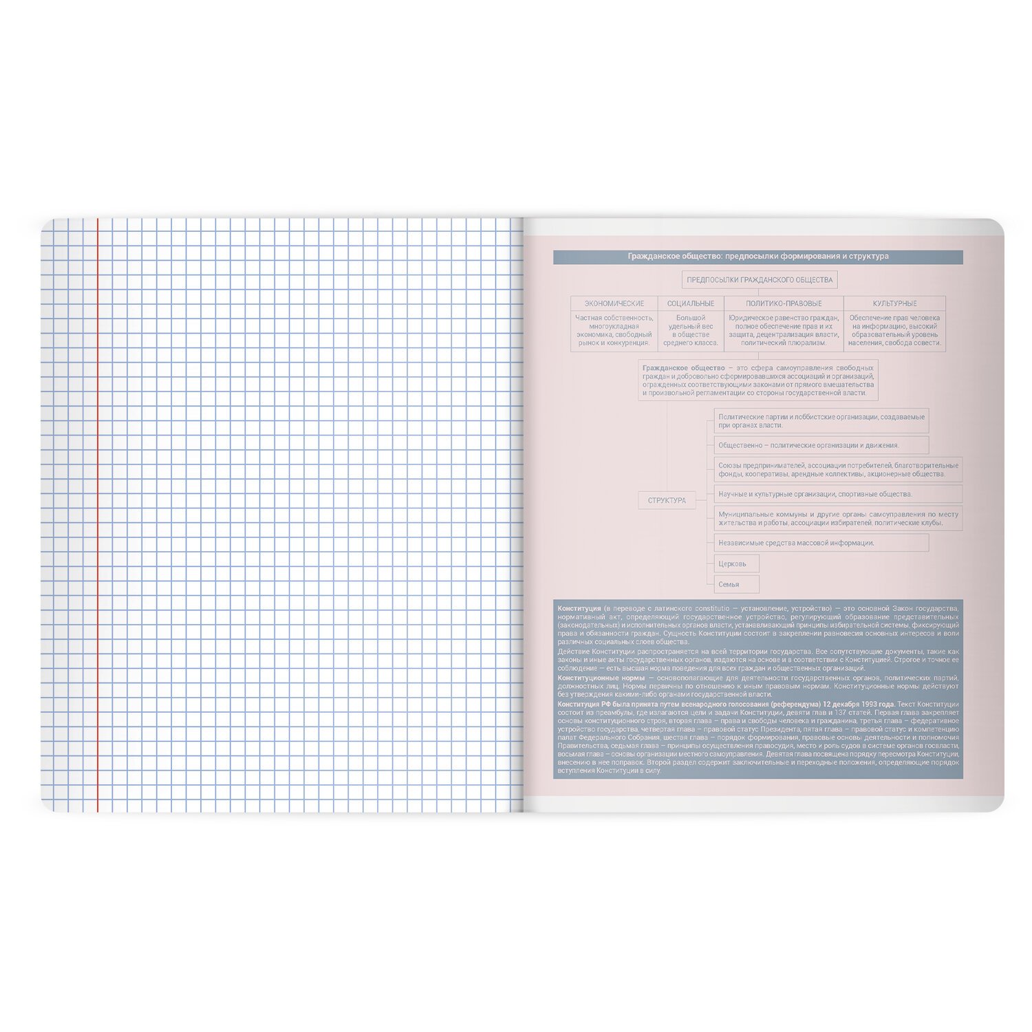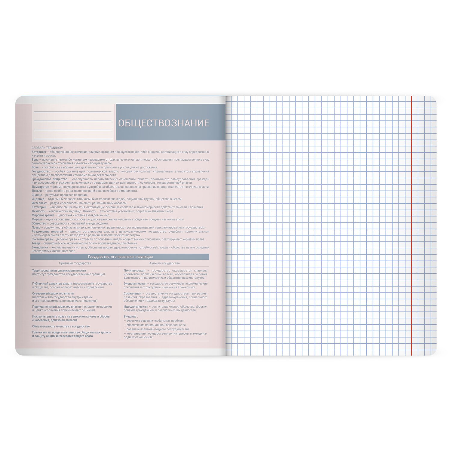 Тетрадь по обществознанию формата А5 с двойной обложкой: внешняя выполнена из высококачественного износостойкого прозрачного пластика, внутренняя – из качественной офсетной бумаги. Преимущество таких тетрадей заключается в том, что для сохранения внешнего вида не нужно покупать дополнительную обложку. На подкладных листах содержится справочный материал по предмету. Внутренний блок плотностью 60 г/м2 из офсетной бумаги содержит 48 листов в клетку с полями. Белизна блока - 100%. Скрепка надежно соединяет листы между собой.