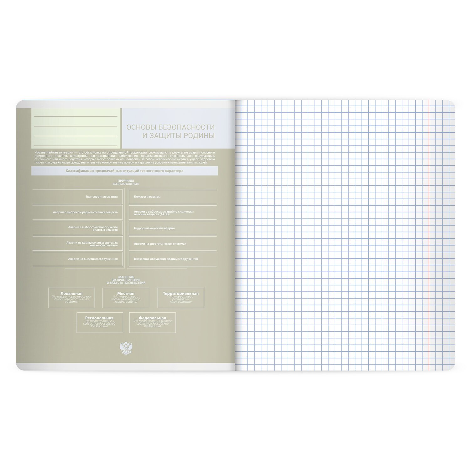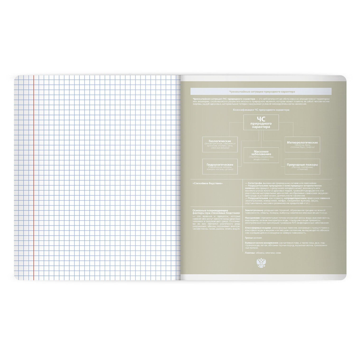 Тетрадь по ОБЗР формата А5 с двойной обложкой: внешняя выполнена из высококачественного износостойкого прозрачного пластика, внутренняя – из качественной офсетной бумаги. Преимущество таких тетрадей заключается в том, что для сохранения внешнего вида не нужно покупать дополнительную обложку. На подкладных листах содержится справочный материал по предмету. Внутренний блок плотностью 60 г/м2 из офсетной бумаги содержит 48 листов в клетку с полями. Белизна блока - 100%. Скрепка надежно соединяет листы между собой.