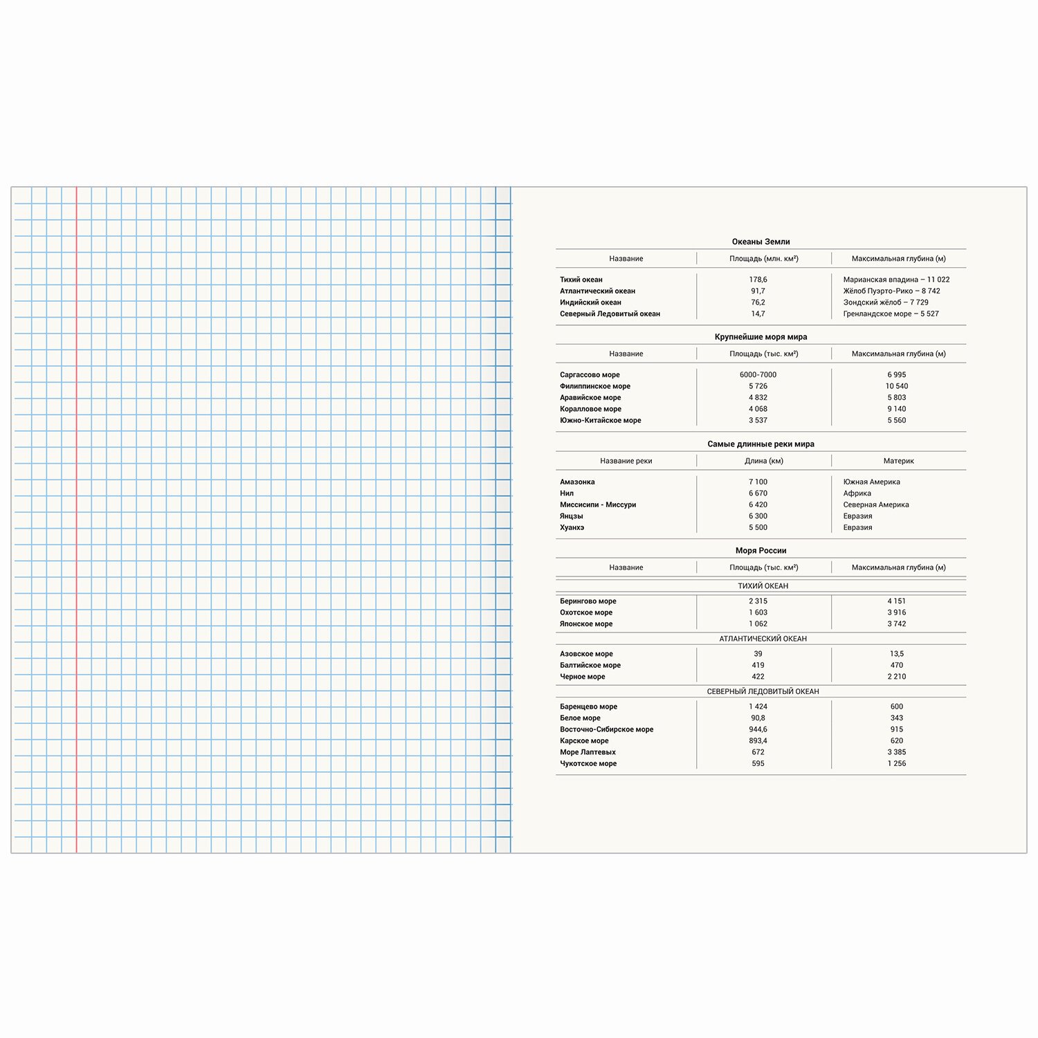 Тетрадь 48 листов, формат А5 (165х202 мм). Изготовлена из высококачественной офсетной бумаги 100% белизны, плотностью 60 г/м2. Листы соединены скобами. Линовка блока - в клетку, поля красные. Обложка выполнена из мелованного картона плотностью 190 г/м2. В справочном материале собраны основные подсказки по школьному предмету для учащихся.