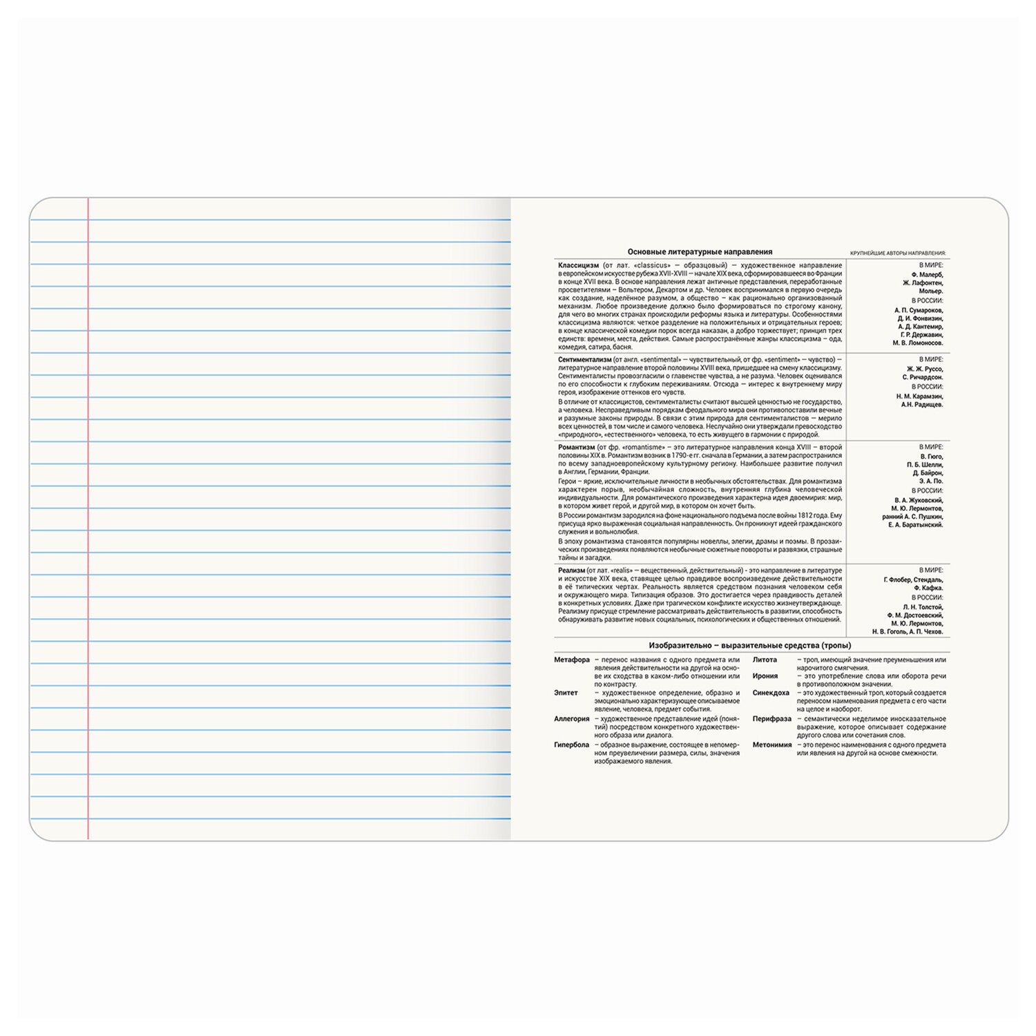 Тетрадь по литературе формата А5 (165х202 мм) содержит 48 листов, изготовленных из высококачественной офсетной бумаги 100% белизны, плотностью 60 г/м2. Листы соединены скобами. Линовка блока - в линию, красные поля.