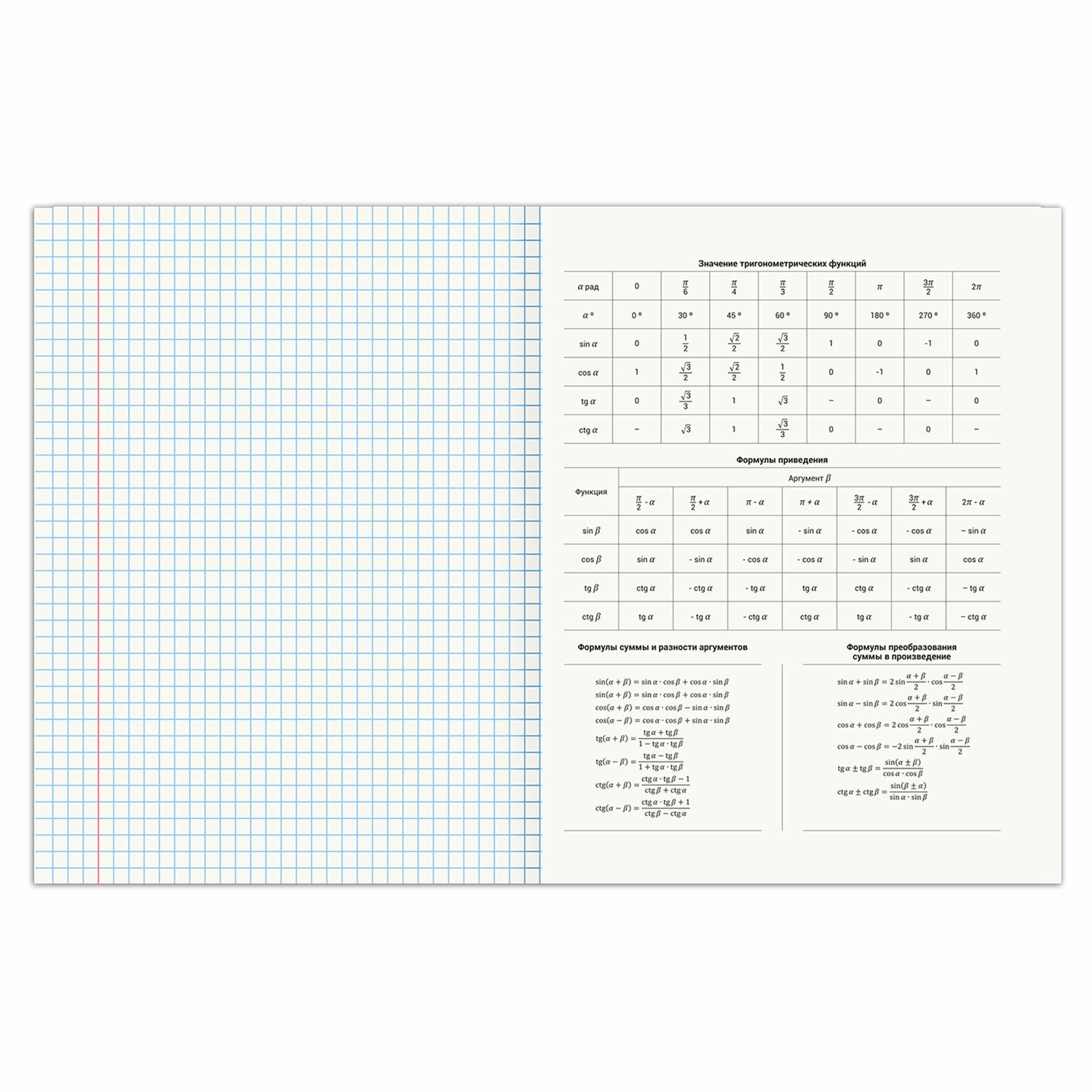 Тетрадь 48 листов, формат А5 (165х202 мм). Изготовлена из высококачественной офсетной бумаги плотностью 60 г/м2, 100% белизны. Листы соединены скобами. Линовка блока - в клетку, поля красные. Обложка выполнена из мелованного картона плотностью 190 г/м2. В справочном материале собраны основные подсказки по школьному предмету для учащихся.