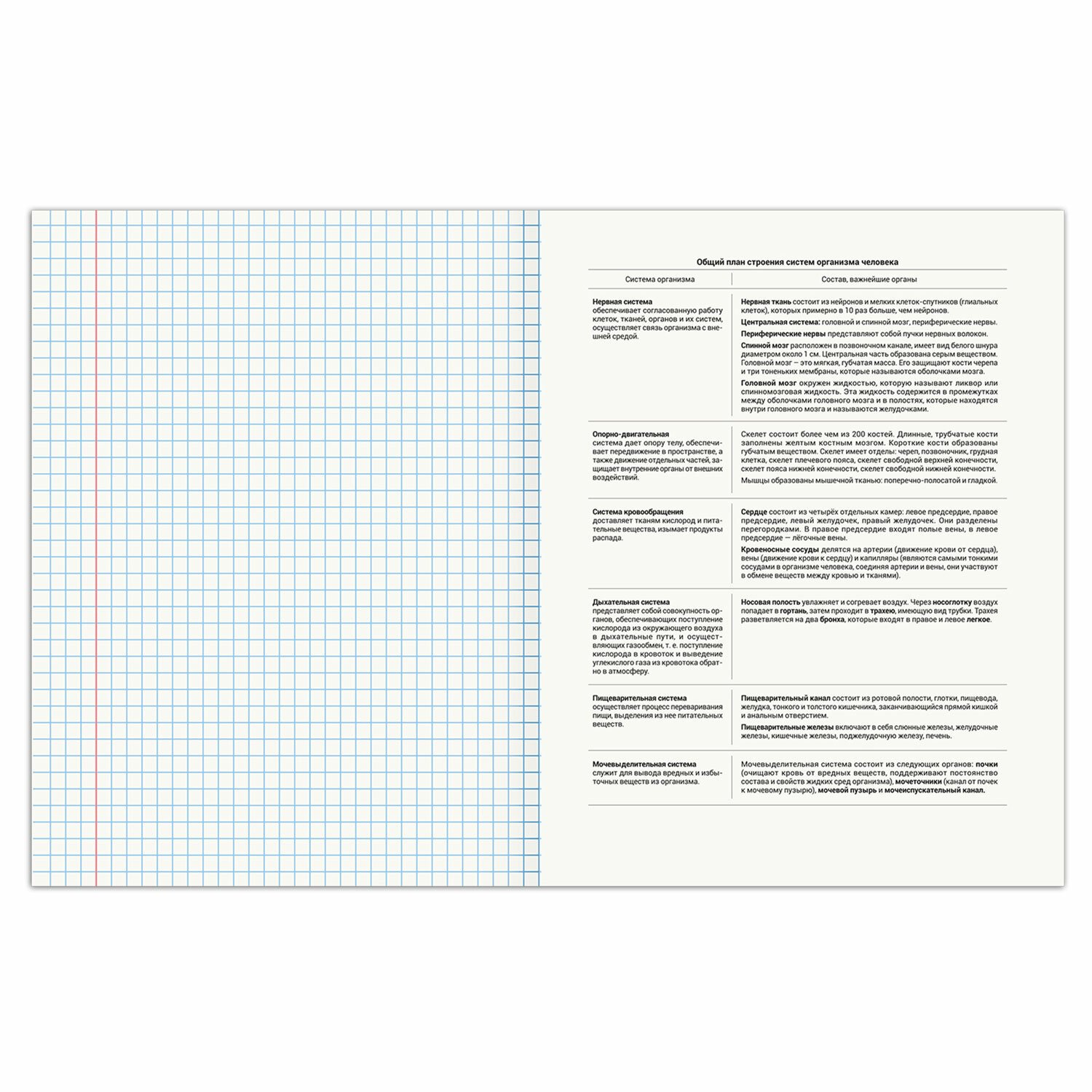 Тетрадь 48 листов, формат А5 (165х202 мм). Изготовлена из высококачественной офсетной бумаги плотностью 60 г/м2, 100% белизны. Листы соединены скобами. Линовка блока - в клетку, поля красные. Обложка выполнена из мелованного картона плотностью 190 г/м2. В справочном материале собраны основные подсказки по школьному предмету для учащихся.