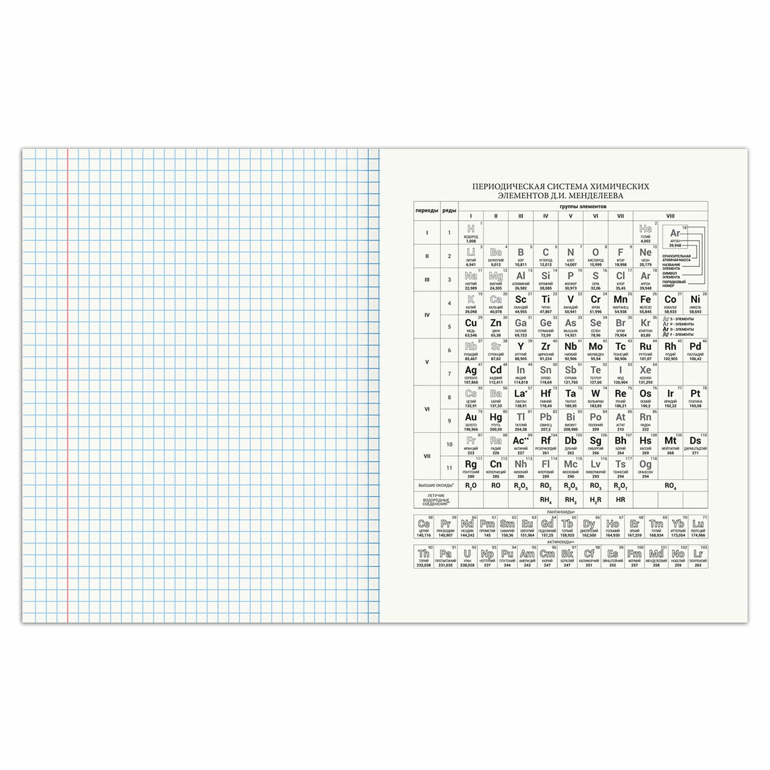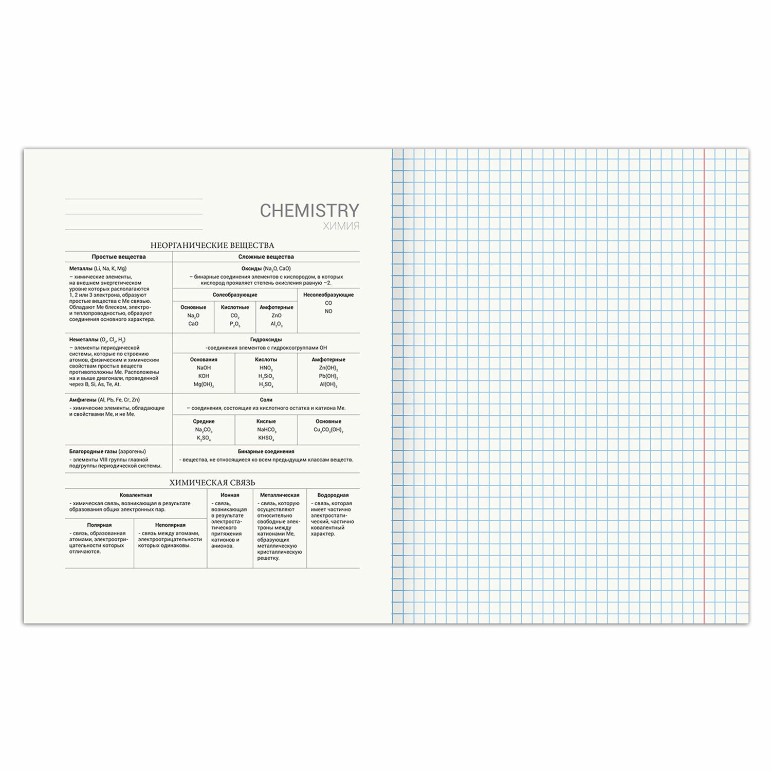 Тетрадь 48 листов, формат А5 (165х202 мм). Изготовлена из высококачественной офсетной бумаги плотностью 60 г/м2, 100% белизны. Листы соединены скобами. Линовка блока - в клетку, поля красные. Обложка выполнена из мелованного картона плотностью 190 г/м2. В справочном материале собраны основные подсказки по школьному предмету для учащихся.