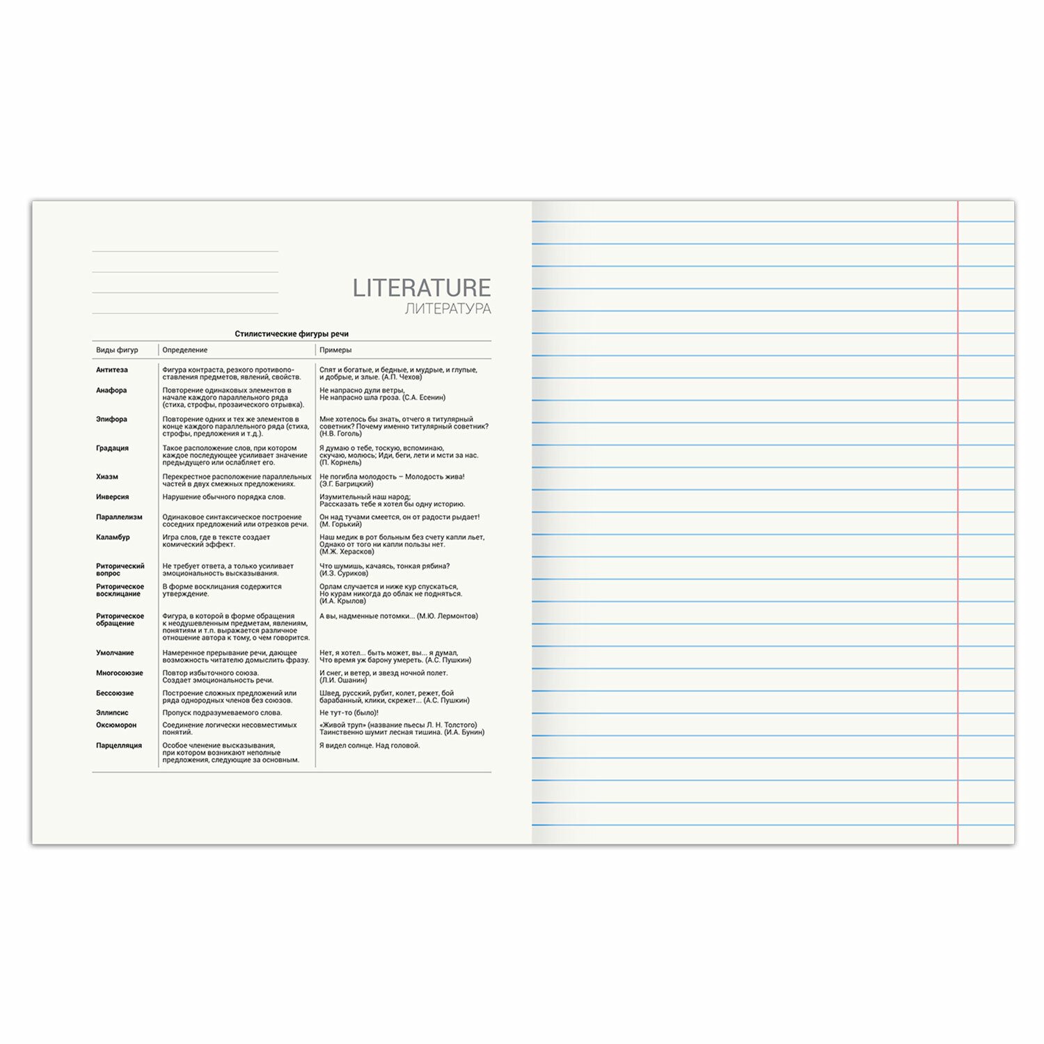 Тетрадь 48 листов, формат А5 (165х202 мм). Изготовлена из высококачественной офсетной бумаги плотностью 60 г/м2, 100% белизны. Листы соединены скобами. Линовка блока - в линию, поля красные. Обложка выполнена из мелованного картона плотностью 190 г/м2. В справочном материале собраны основные подсказки по школьному предмету для учащихся.