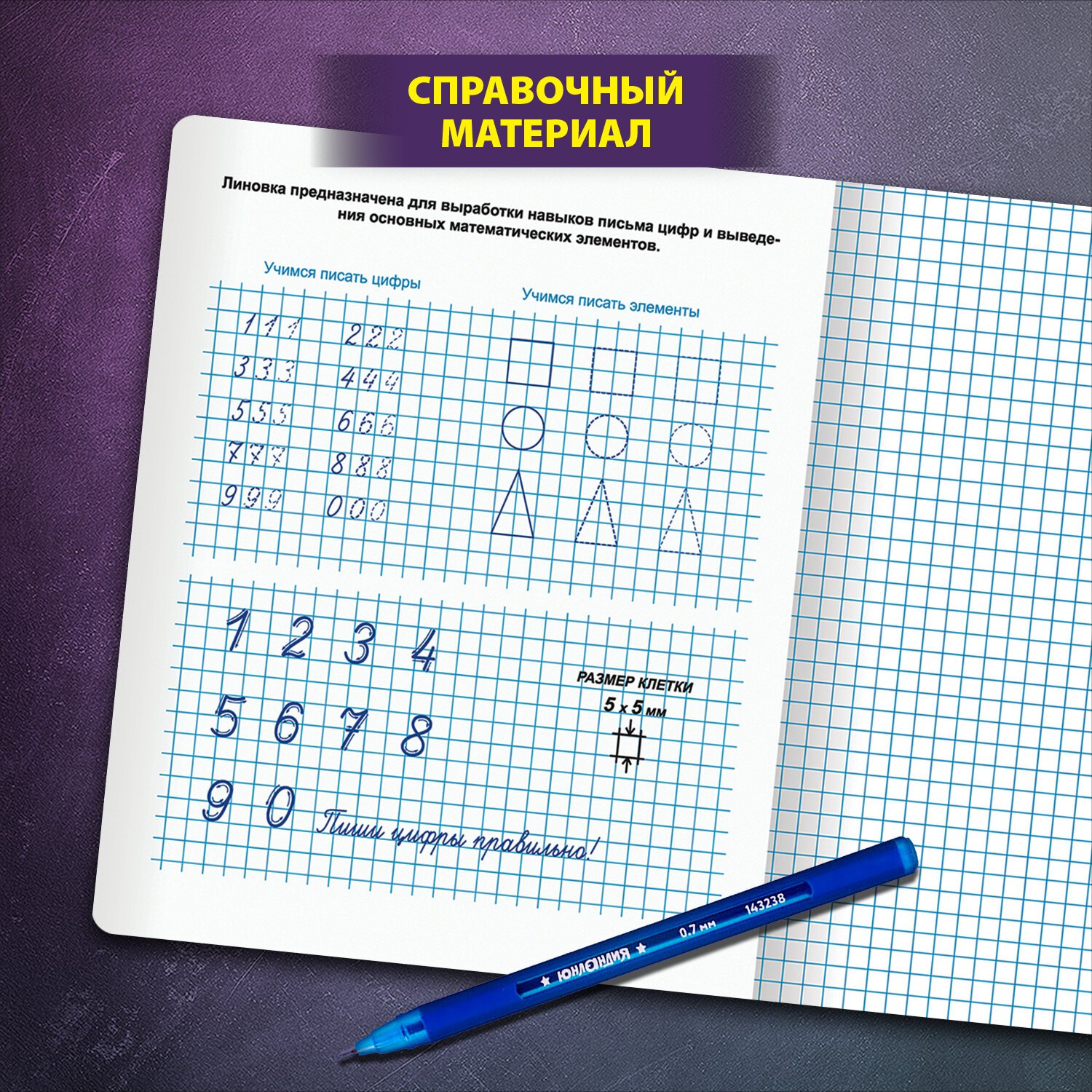 Справочный материал внутри тетради поможет выработать навыки письма цифр и выведения основных математических элементов.