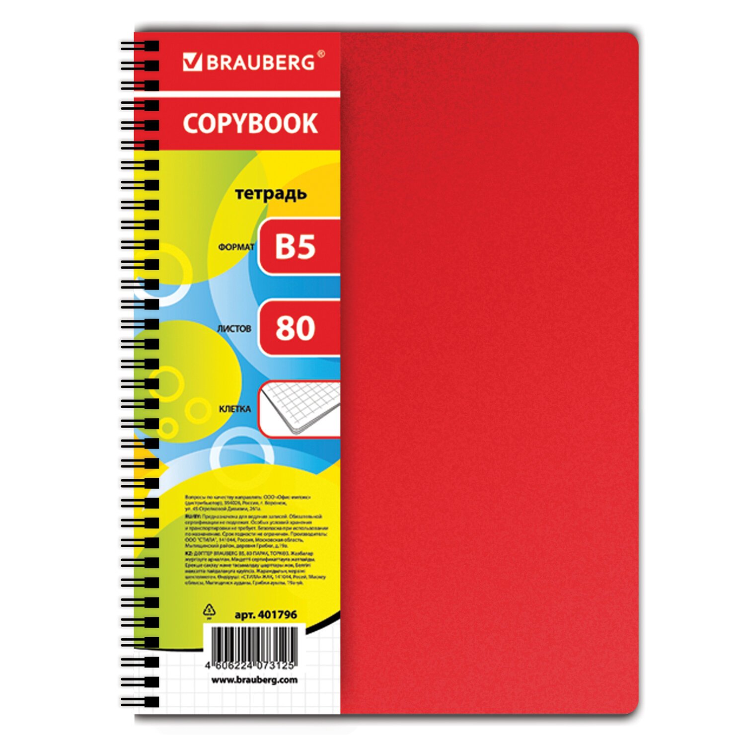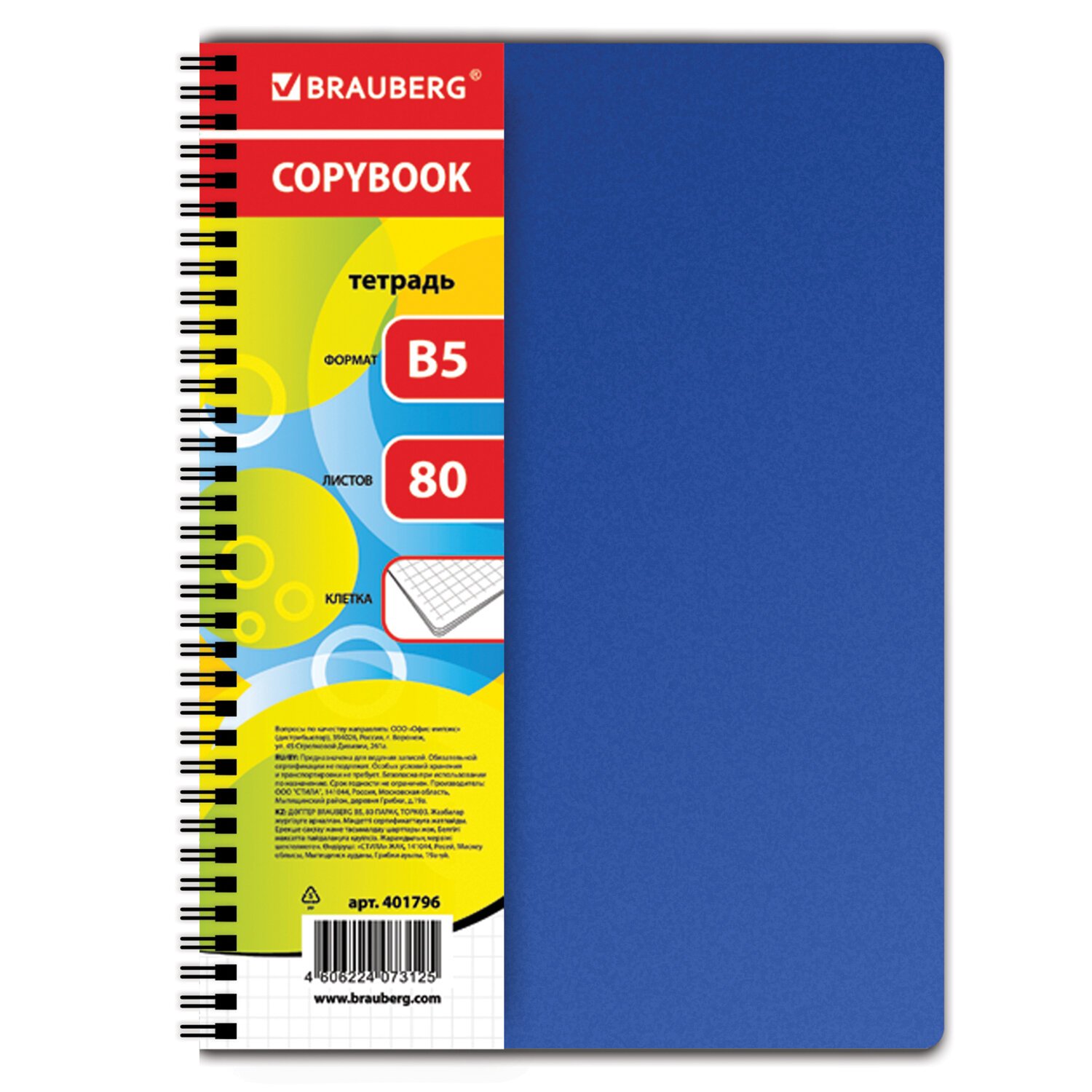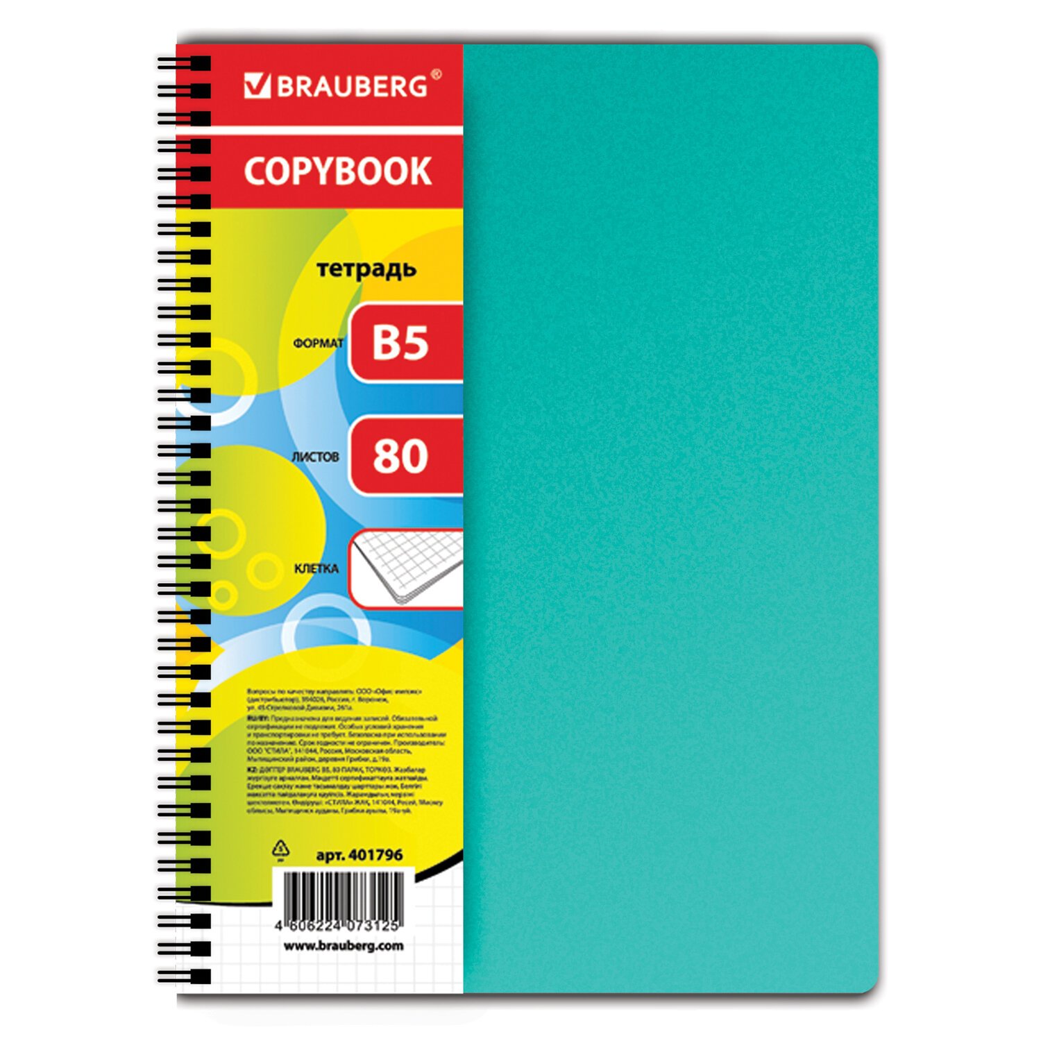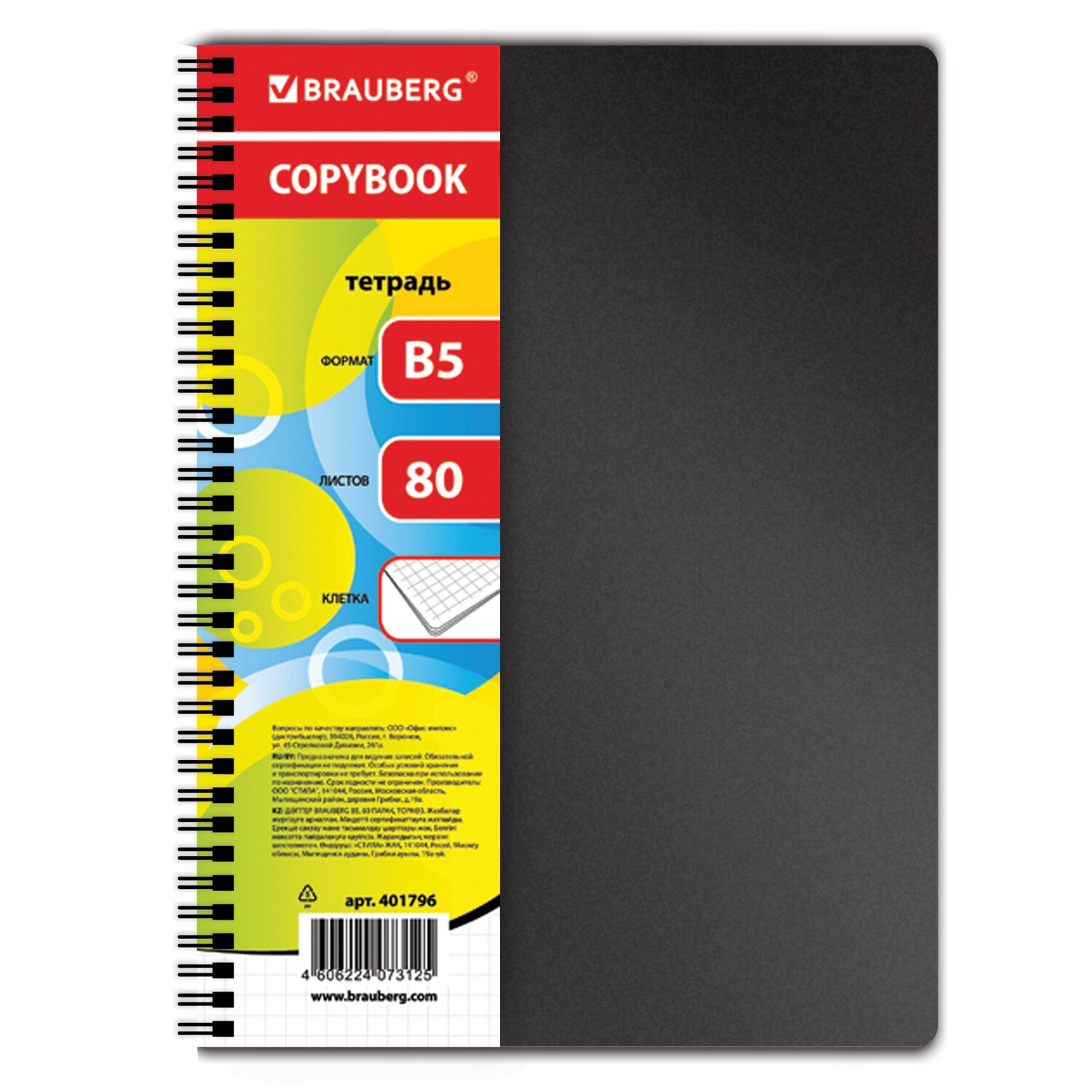 Тетрадь В5 (175х248 мм), 80 л., BRAUBERG, гребень, клетка, обложка пластик, "ОФИС", 401796