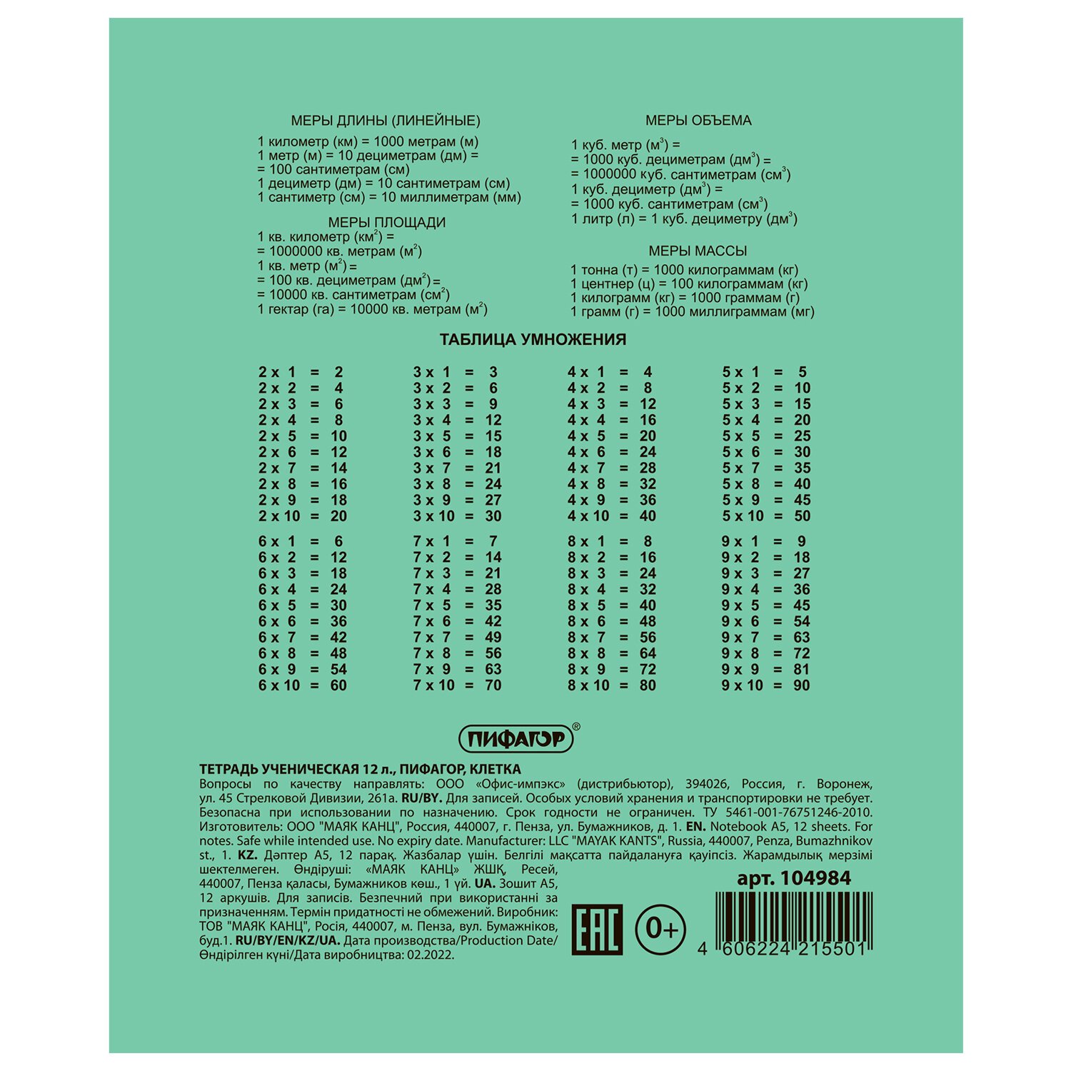 Тетрадь ПИФАГОР с классической зеленой обложкой подойдет для занятий школьнику преимущественно начальных и средних классов. На обороте представлена дополнительная информация.