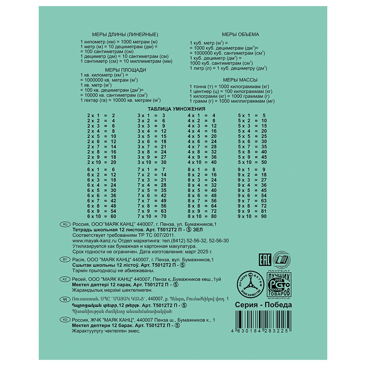 Тетрадь ЗЕЛЁНАЯ обложка 12л, клетка с полями, ПОБЕДА!, офсет, "Маяк", Т5012 Т2П-5