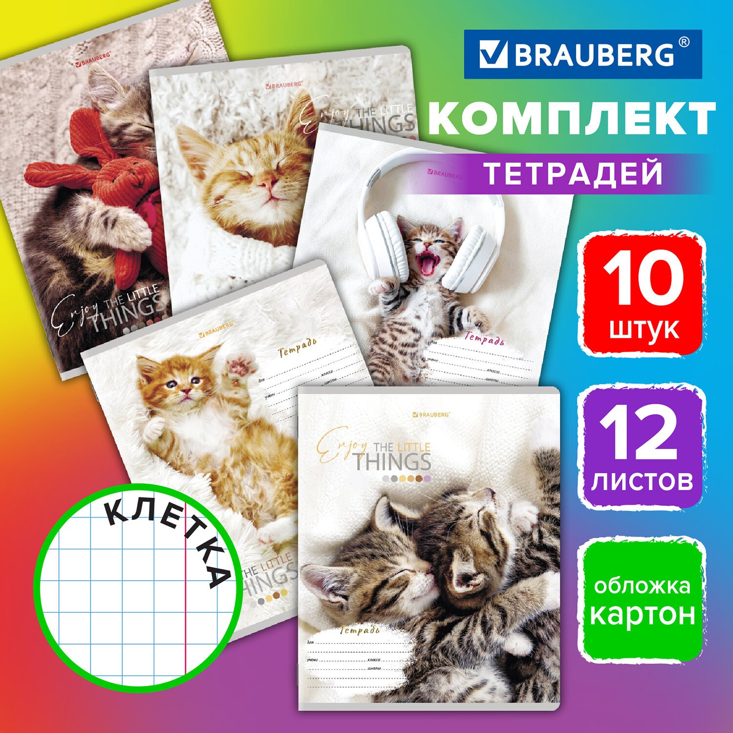 Тетради 12 л. КОМПЛЕКТ 10 шт. BRAUBERG, клетка, обложка картон, ПИТОМЦЫ, 106663