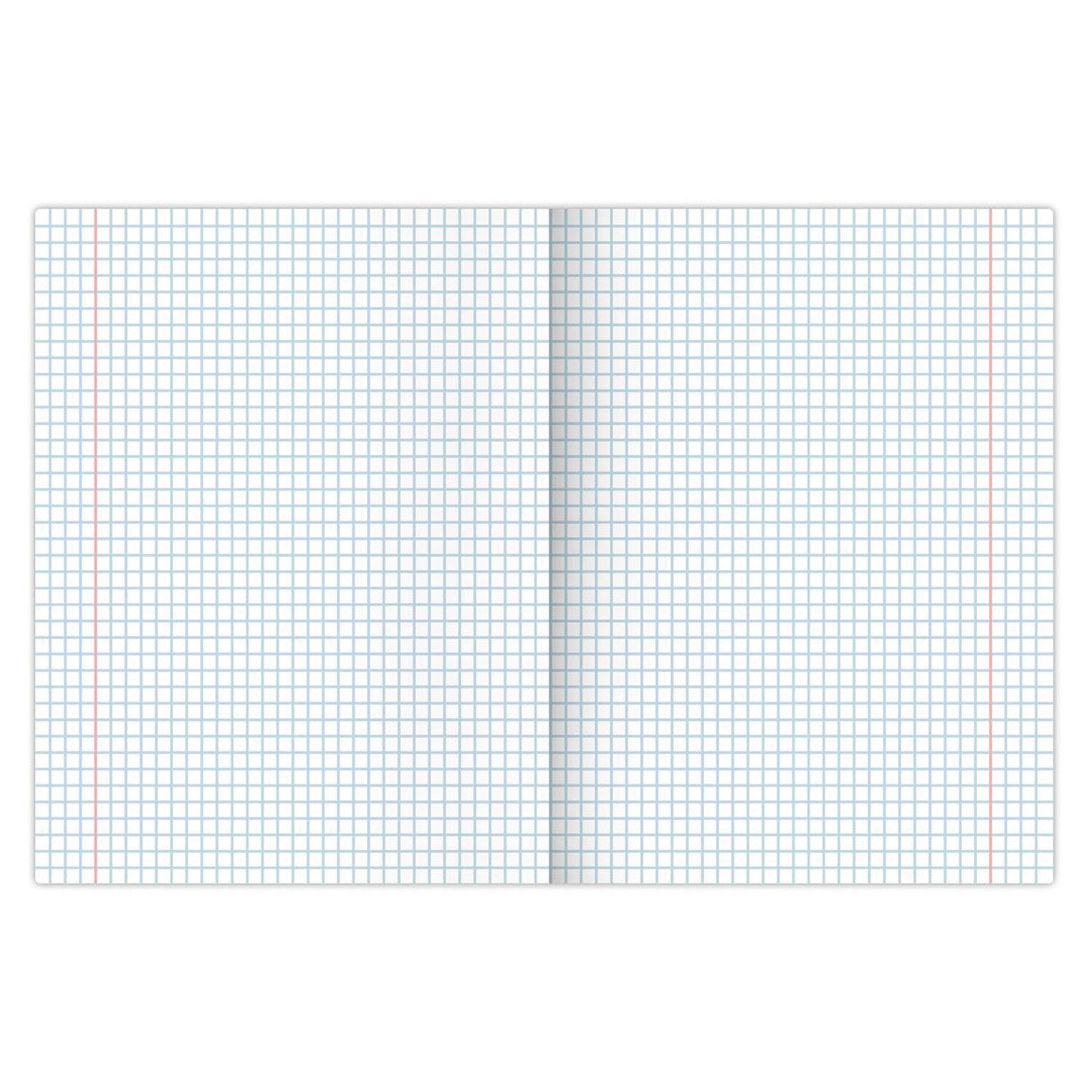 Внутренний блок плотностью 60 г/м2 из офсетной бумаги имеет линовку в клетку с полями. Содержит 18 листов. Обложка изготовлена из импортного мелованного картона. Скрепка надежно скрепляет листы между собой. Справочная информация на оборотной (задней) стороне обложки содержит меры длины, объема, массы, площади и таблицу умножения.