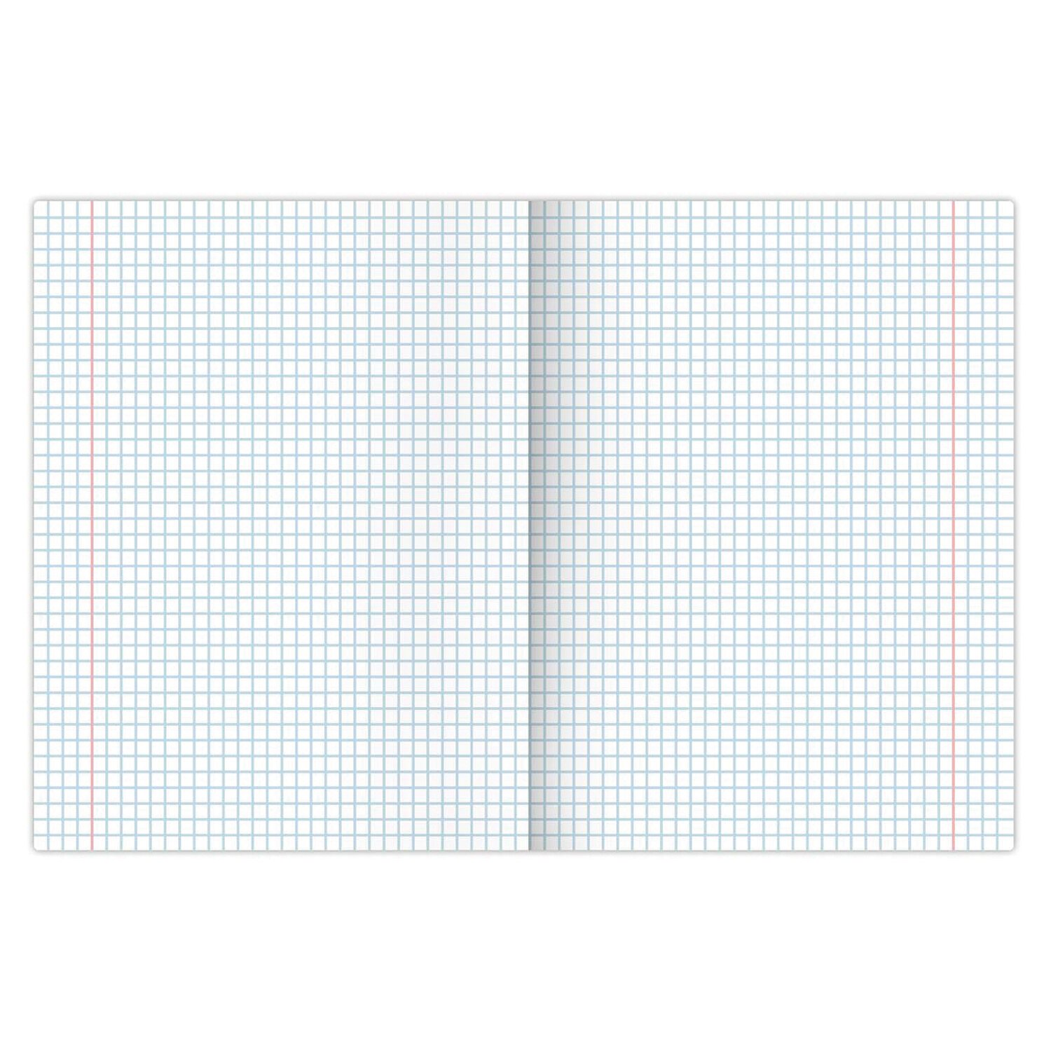 Внутренний блок плотностью 60 г/м2 из офсетной бумаги имеет линовку в клетку с полями. Содержит 18 листов. Обложка изготовлена из импортного мелованного картона. Скрепка надежно скрепляет листы между собой. Справочная информация на оборотной (задней) стороне обложки содержит меры длины, объема, массы, площади и таблицу умножения.
