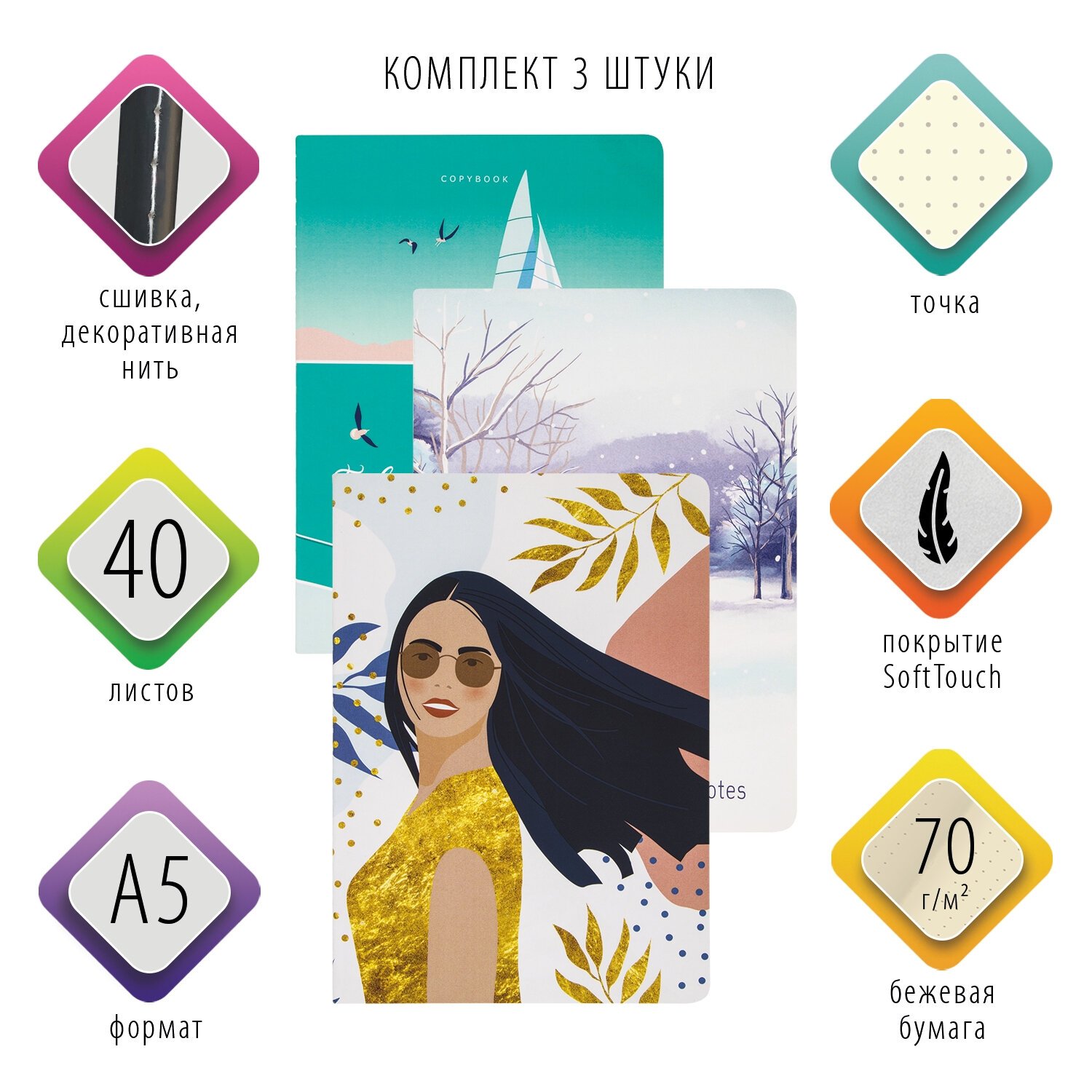 Тетради 40 л. в точку обложка SoftTouch, НАБОР 3 шт., бежевая бумага 70 г/м2, сшивка, А5 (147х210 мм), MEMORIES,BRAUBERG, 403803