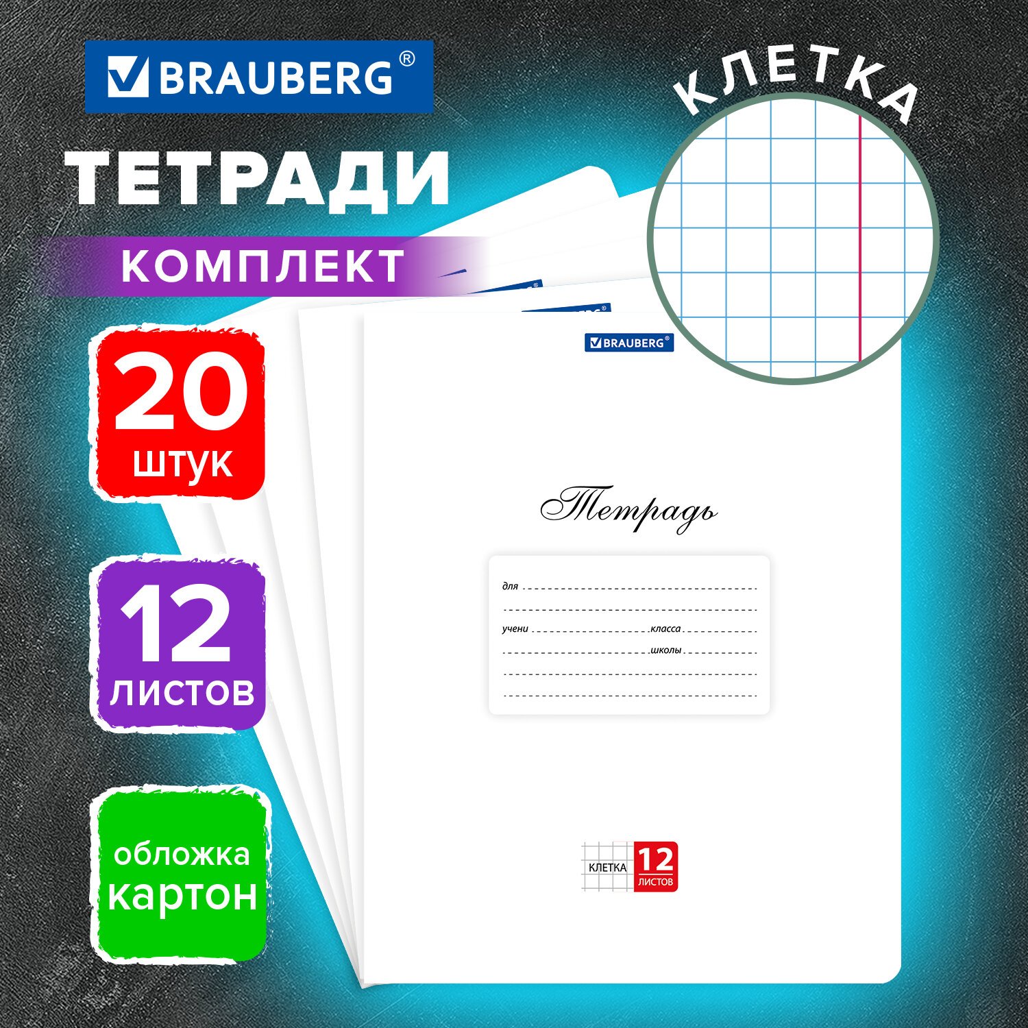Тетради ДЭК 12 л. КОМПЛЕКТ 20 шт. BRAUBERG КЛАССИКА, клетка, обложка картон, БЕЛАЯ, 107071