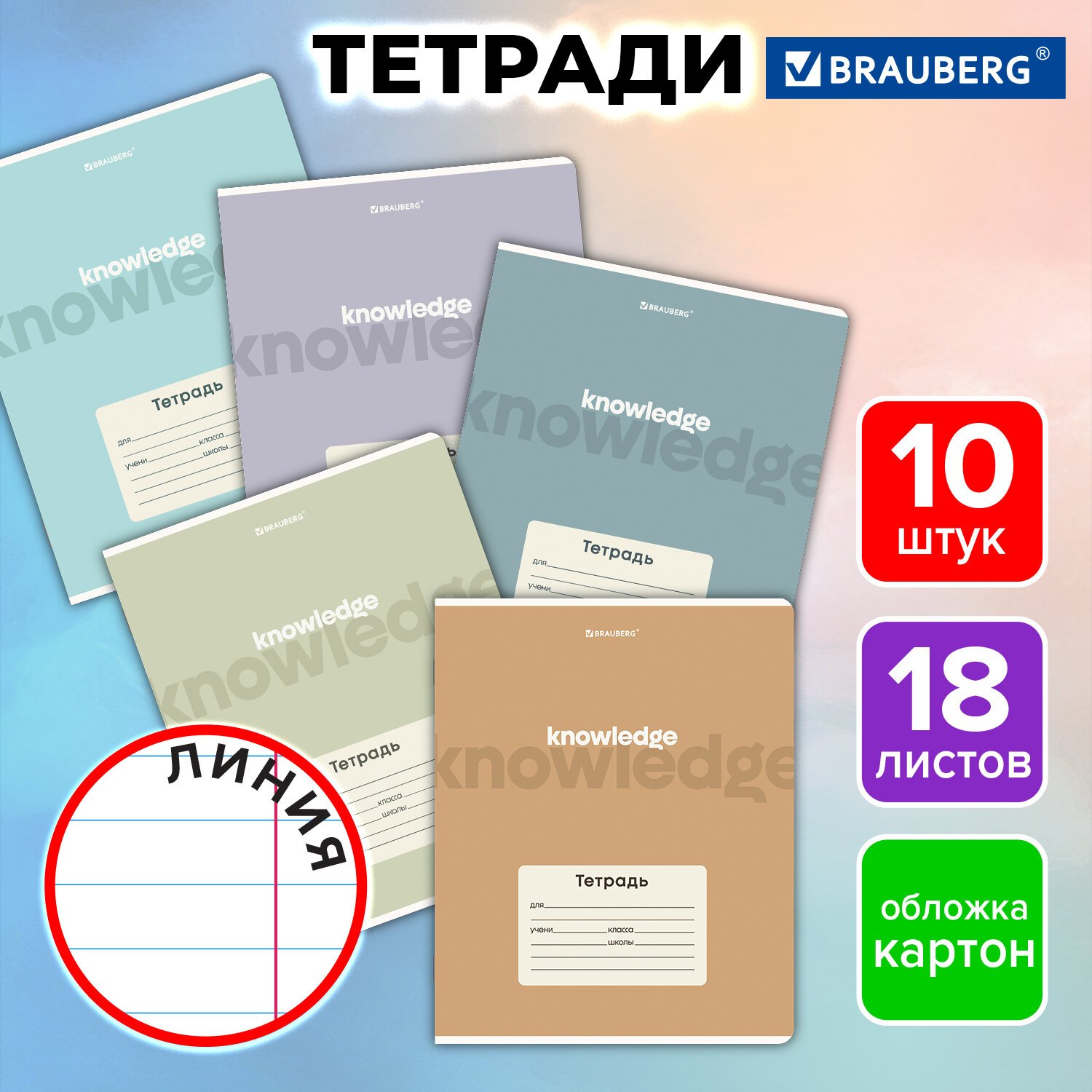 Тетради ДЭК 18 л. КОМПЛЕКТ 10 шт. BRAUBERG, линия, обложка картон, "KNOWLEDGE", 107337