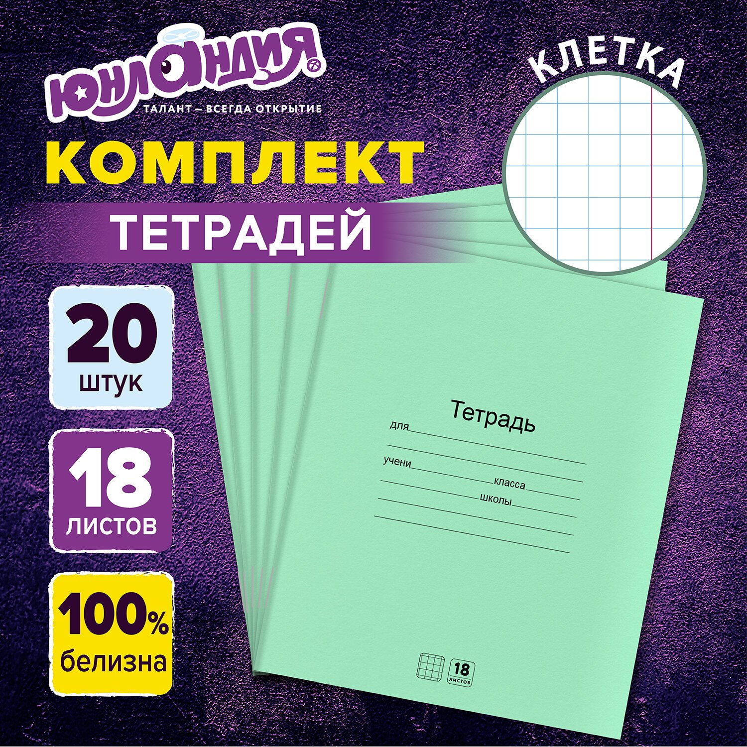 Тетради ДЭК 18 л. КОМПЛЕКТ 20 шт. с ЗЕЛЁНОЙ обложкой, ЮНЛАНДИЯ, клетка, 106744