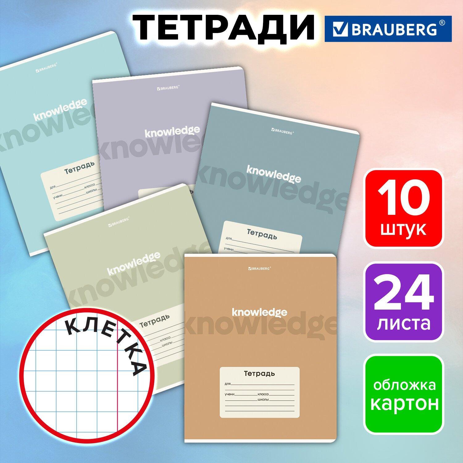 Тетради ДЭК 24 л. КОМПЛЕКТ 10 шт. BRAUBERG, клетка, обложка картон, "KNOWLEDGE", 107341