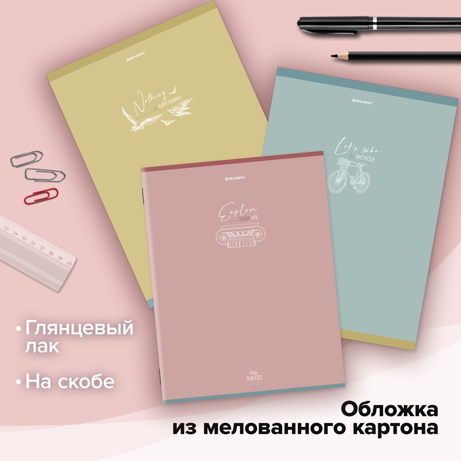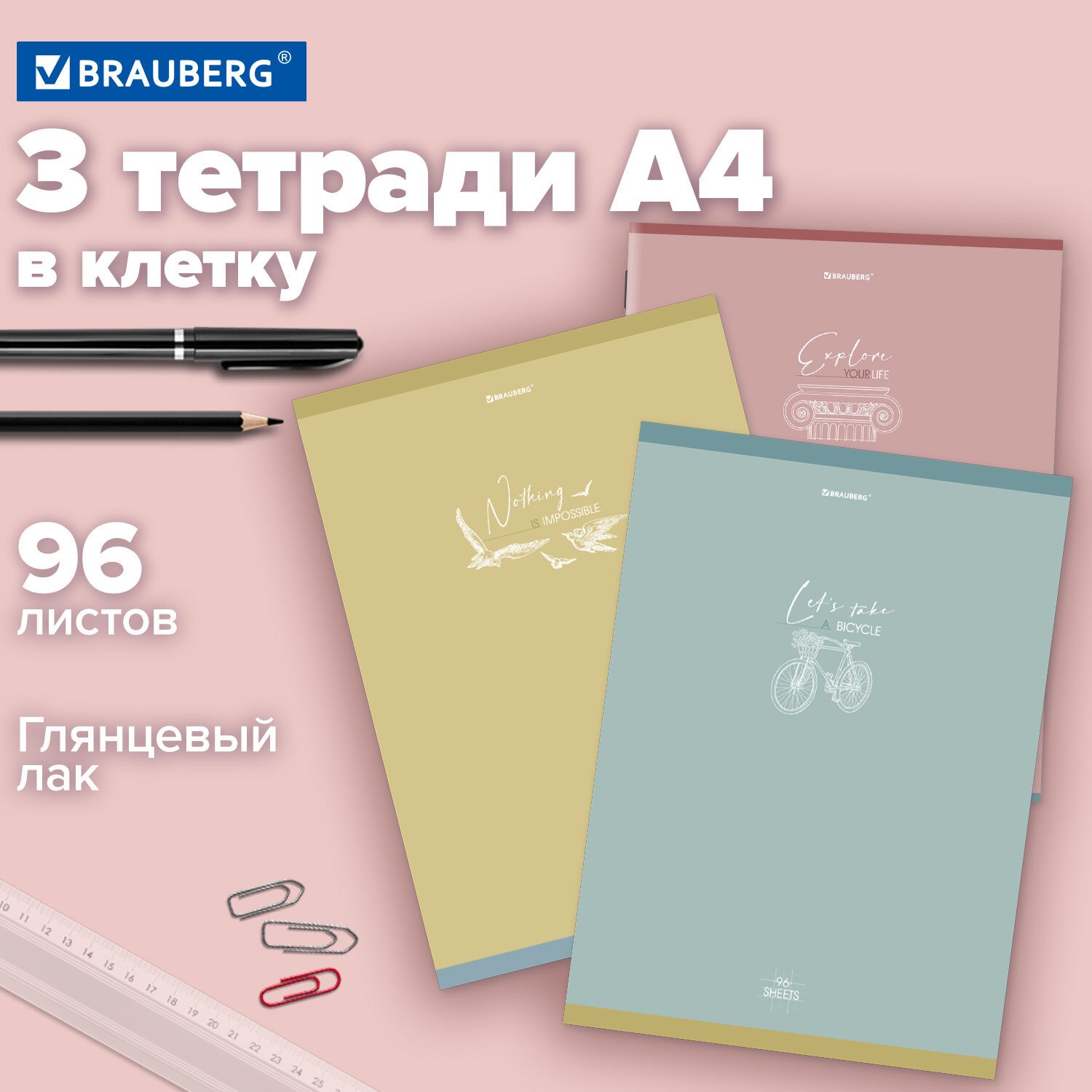 Тетради КОМПЛЕКТ 3 шт. А4, 96 л., BRAUBERG скоба, клетка, глянцевый лак, "Pastel", 404388
