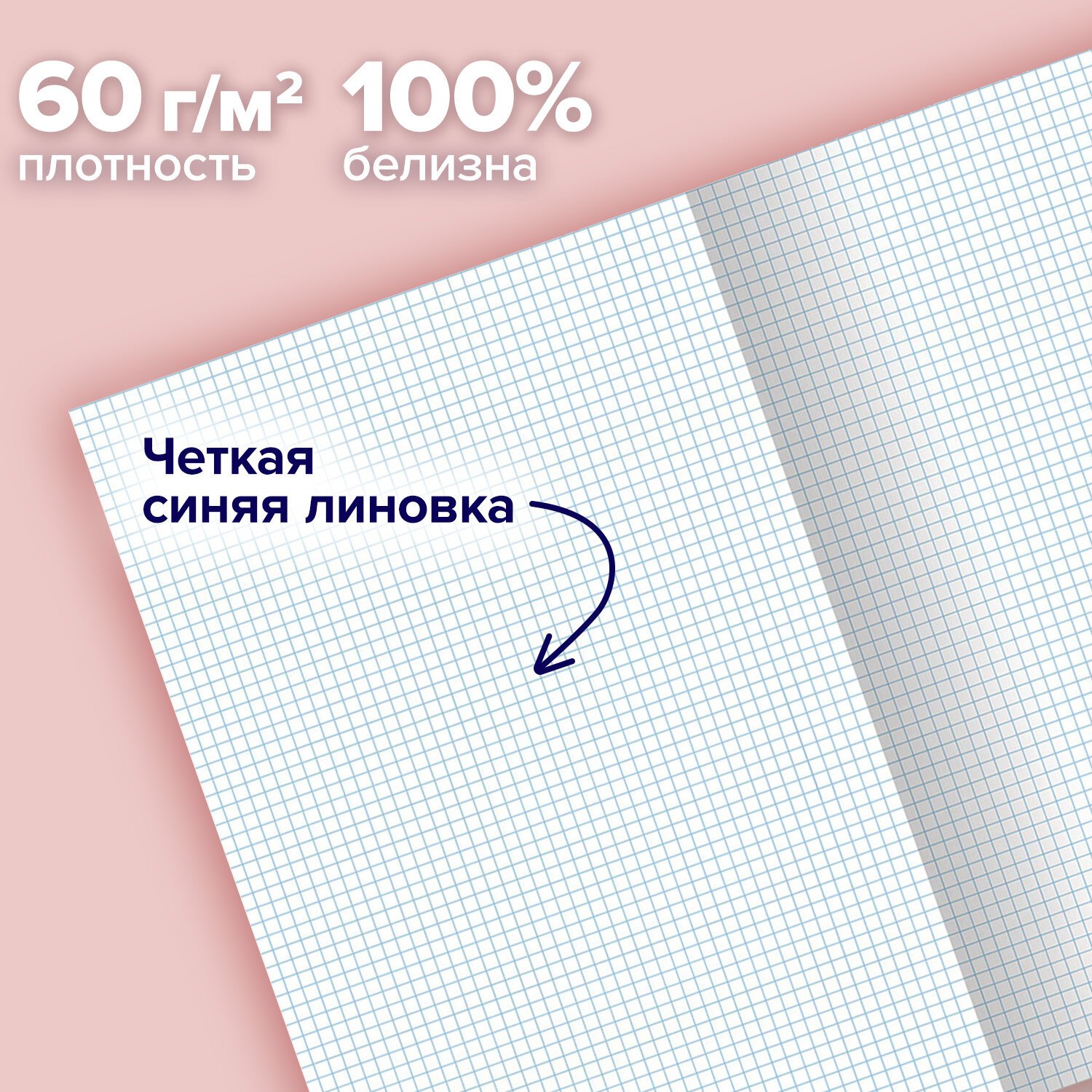 Внутренний блок содержит 96 листов офсетной бумаги плотностью 60 г/м2. Обложка изготовлена из мелованного картона с глянцевой ламинацией. Линовка - клетка. Скоба надежно скрепляет листы между собой. Белизна – 100%. Формат А4.