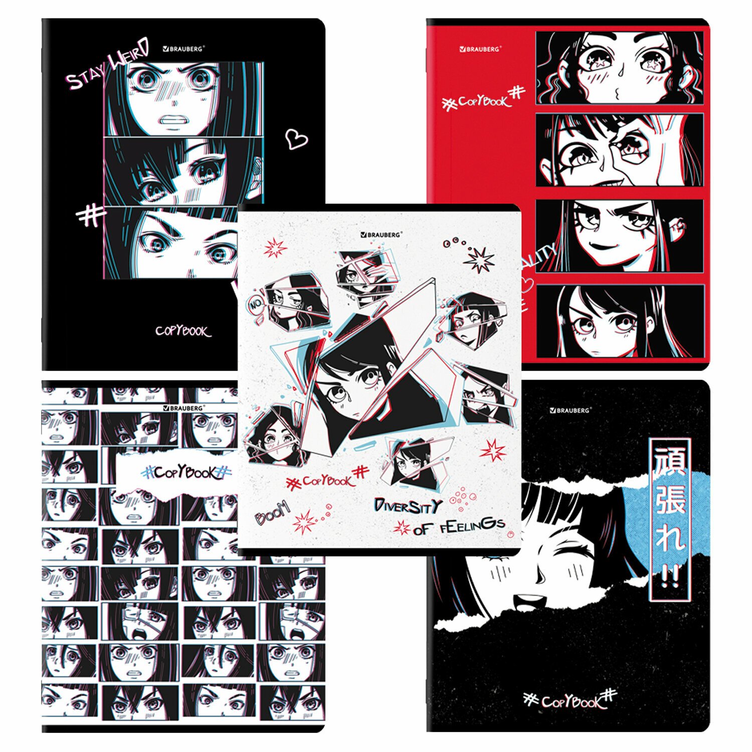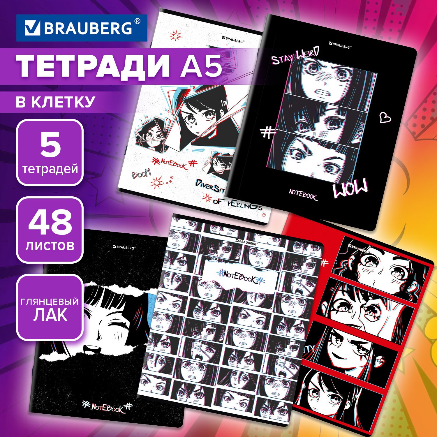 Тетради КОМПЛЕКТ 5 шт., А5, 48 л., BRAUBERG скоба, клетка, глянцевый лак, "Аниме", 404391