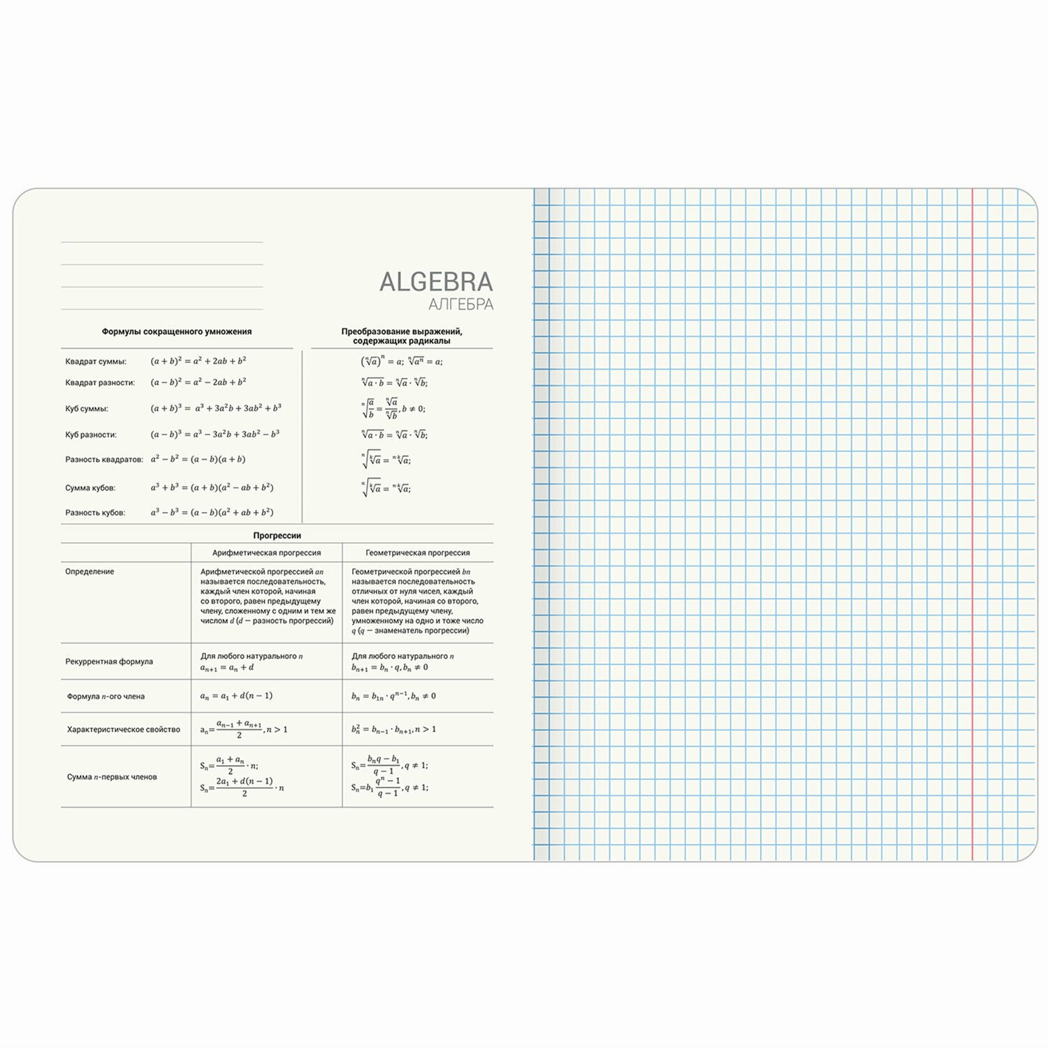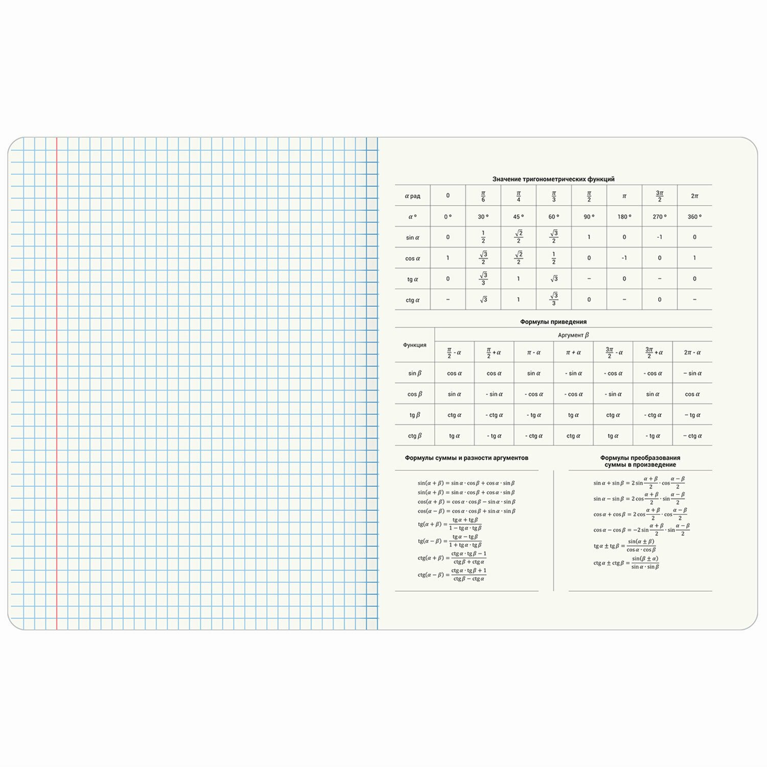 Тетради содержат 48 листов, изготовленных из высококачественной офсетной бумаги плотностью 60 г/м2 и 100% белизны, с красными полями. Листы соединены скобами. Обложка изготовлена из мелованного картона. Матовое покрытие с тиснением фольгой обеспечивает обложке яркий визуальный эффект. В справочном материале собраны основные подсказки по школьному предмету.