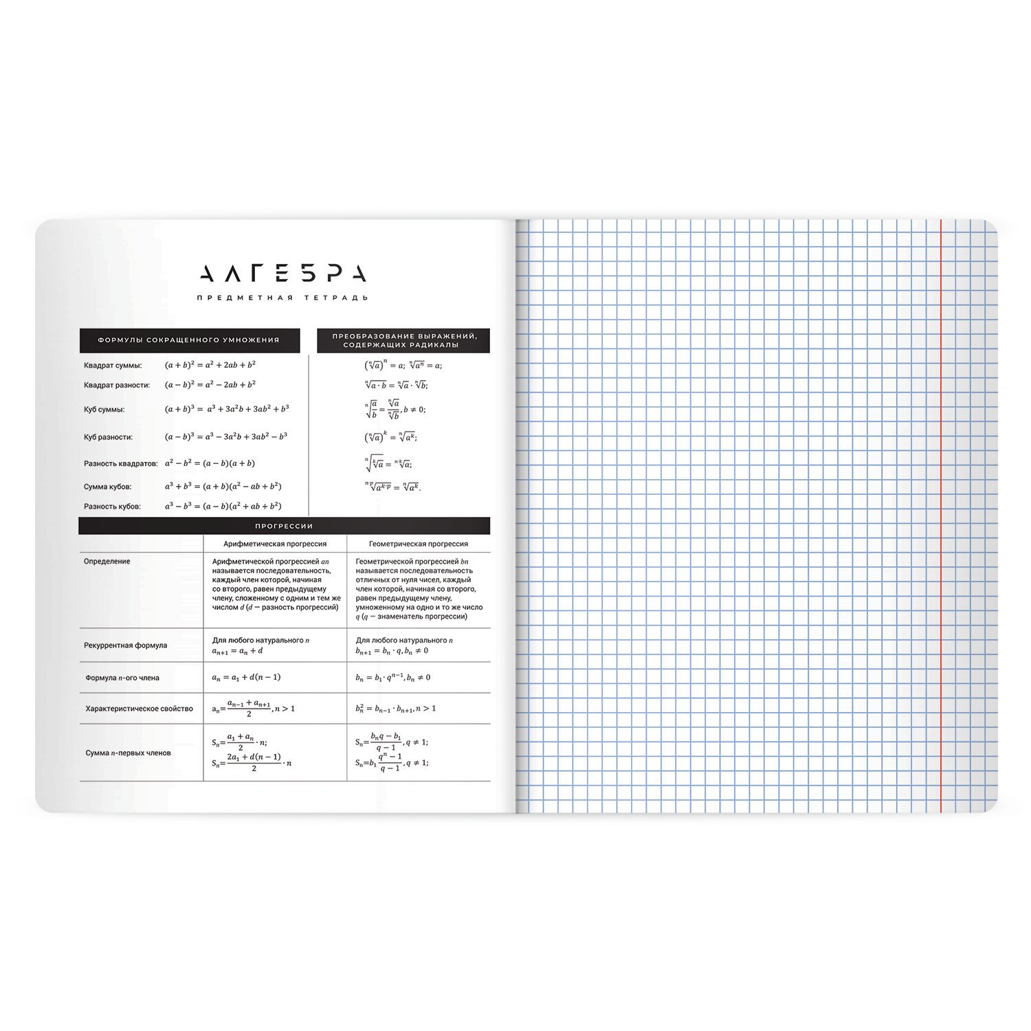 В комплекте 12 тетрадей: Алгебра, Английский язык, Биология, География, Геометрия, Обществознание, История, Информатика, Литература (в линию), Русский язык (в линию), Физика, Химия.