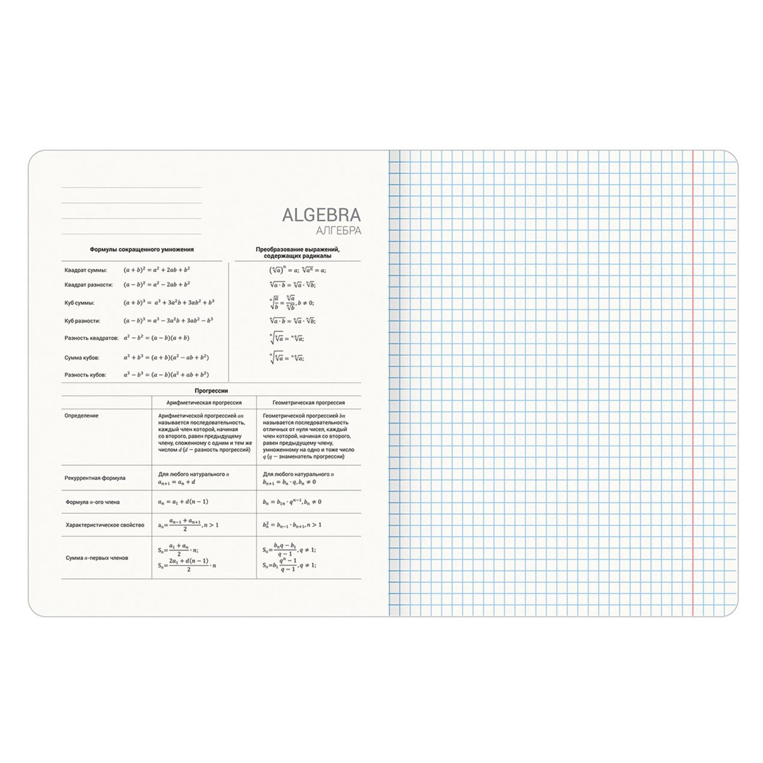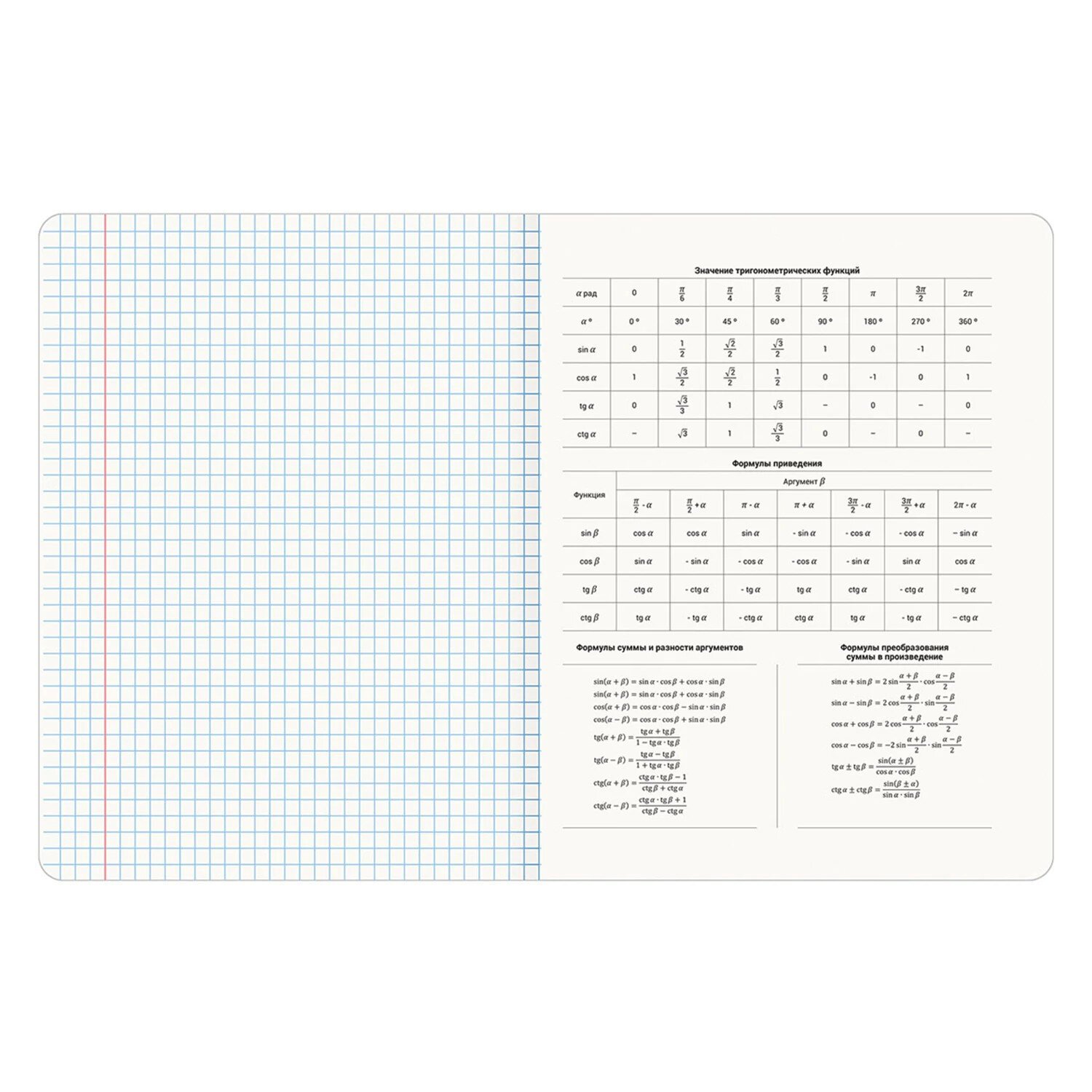 Тетради содержат 48 листов, изготовленных из высококачественной офсетной бумаги плотностью 60 г/м2 и 100% белизны, с красными полями. Листы соединены скобами. Обложка изготовлена из мелованного картона. Ламинация SoftTouch обеспечивает обложке мягкий, бархатистый тактильный эффект. 3D-фольга создает объемный эффект надписи. В справочном материале собраны основные подсказки по школьному предмету.