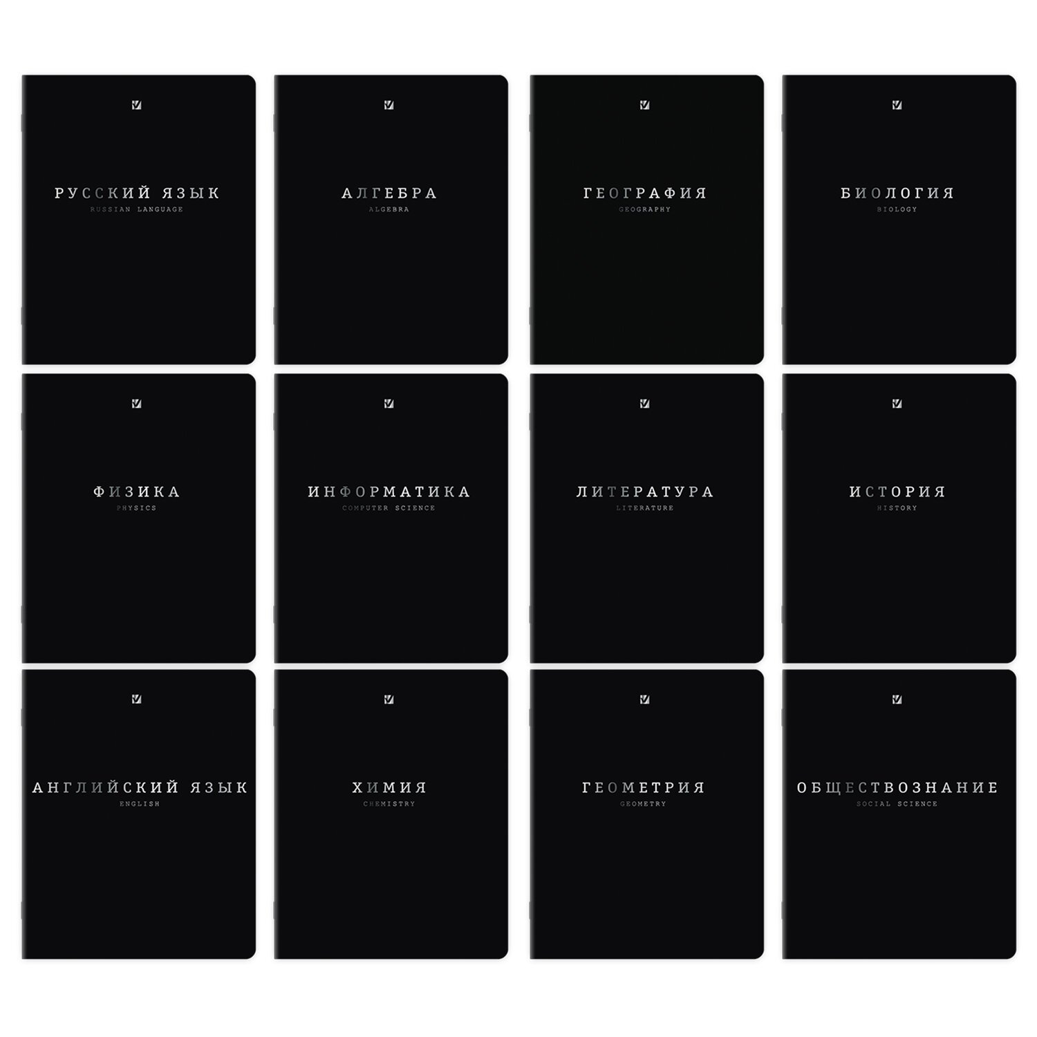 В комплекте 12 тетрадей: Алгебра, Английский язык, Биология, География, Геометрия, Обществознание, История, Информатика, Литература (в линию), Русский язык (в линию), Физика, Химия.