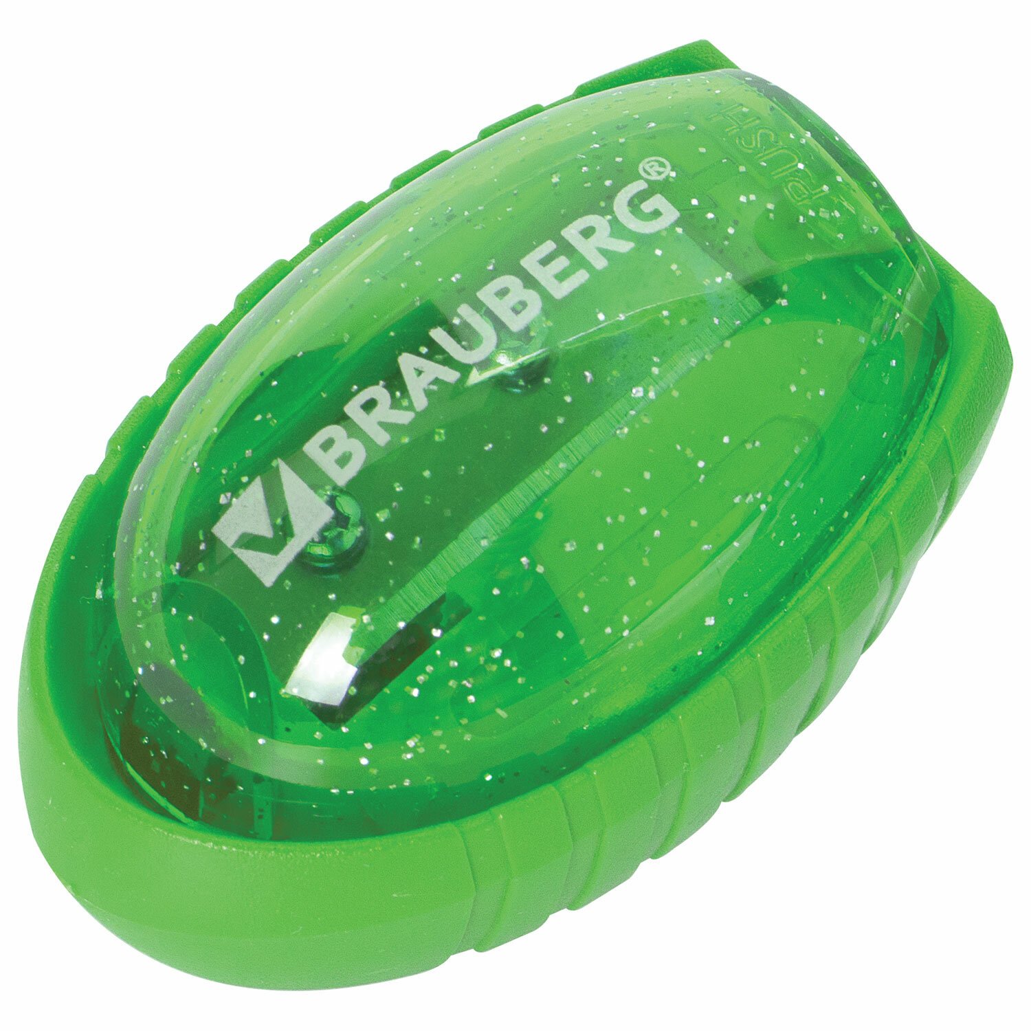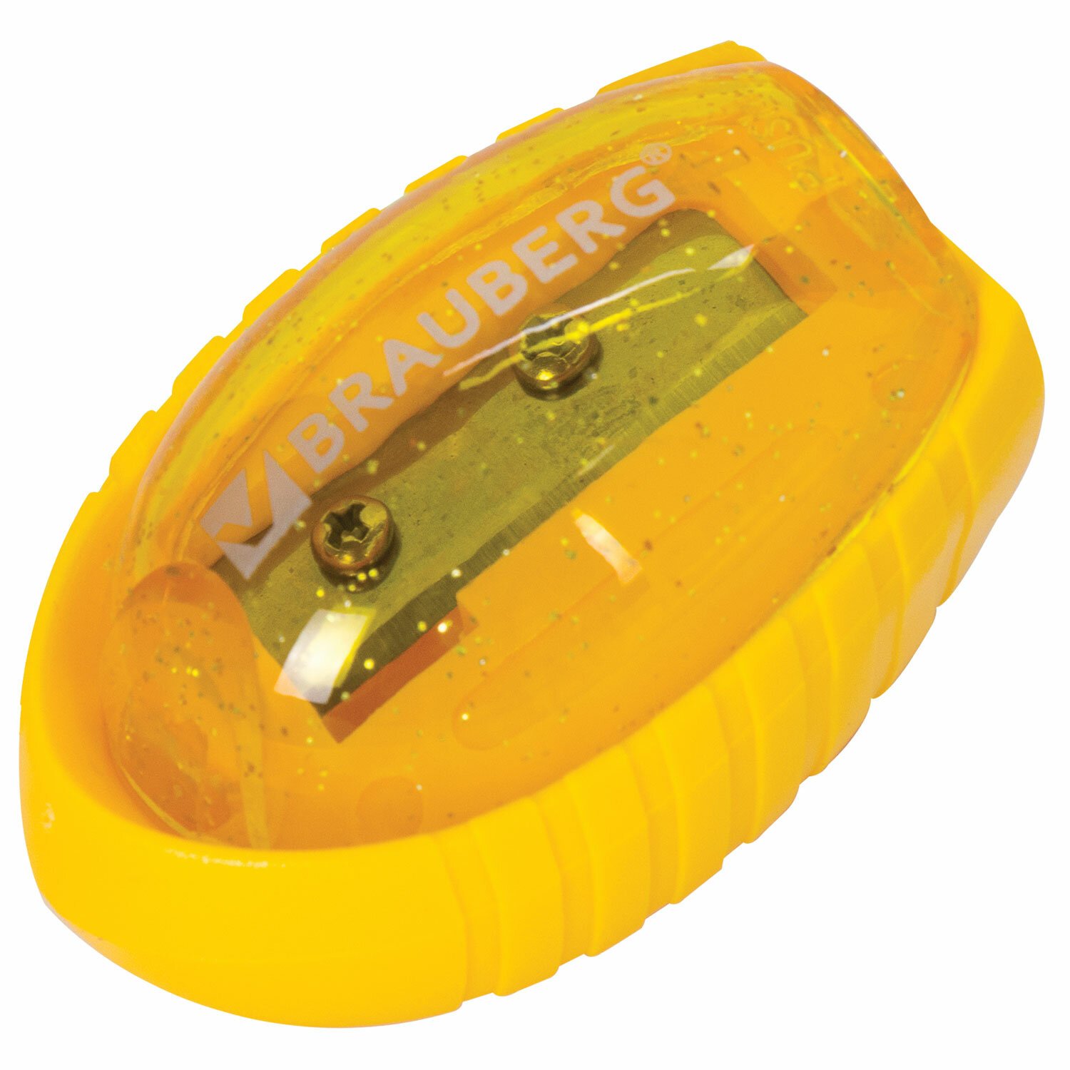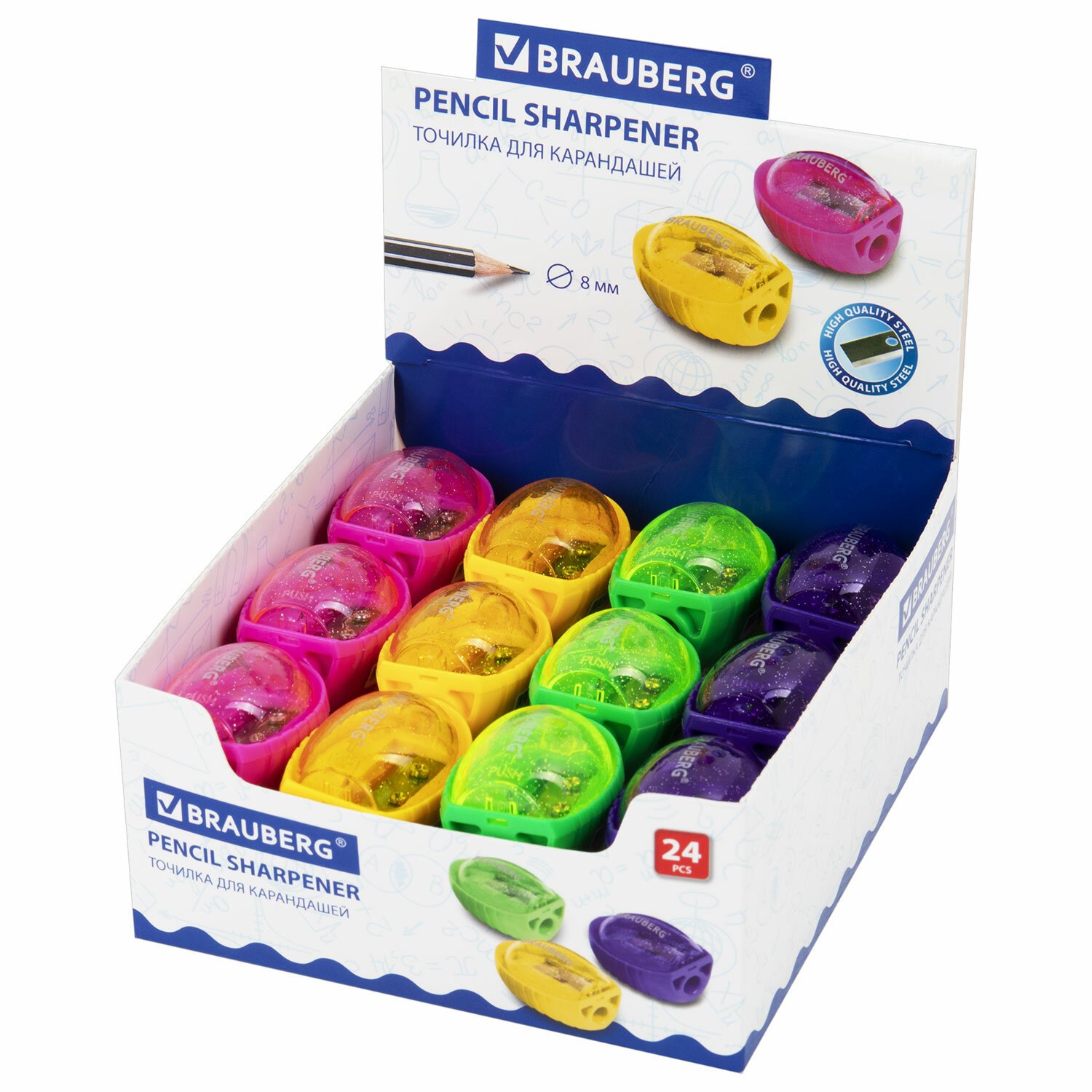 Точилка BRAUBERG "Shuttle", с контейнером, эллиптическая, ассорти, в картонном дисплее, 222505