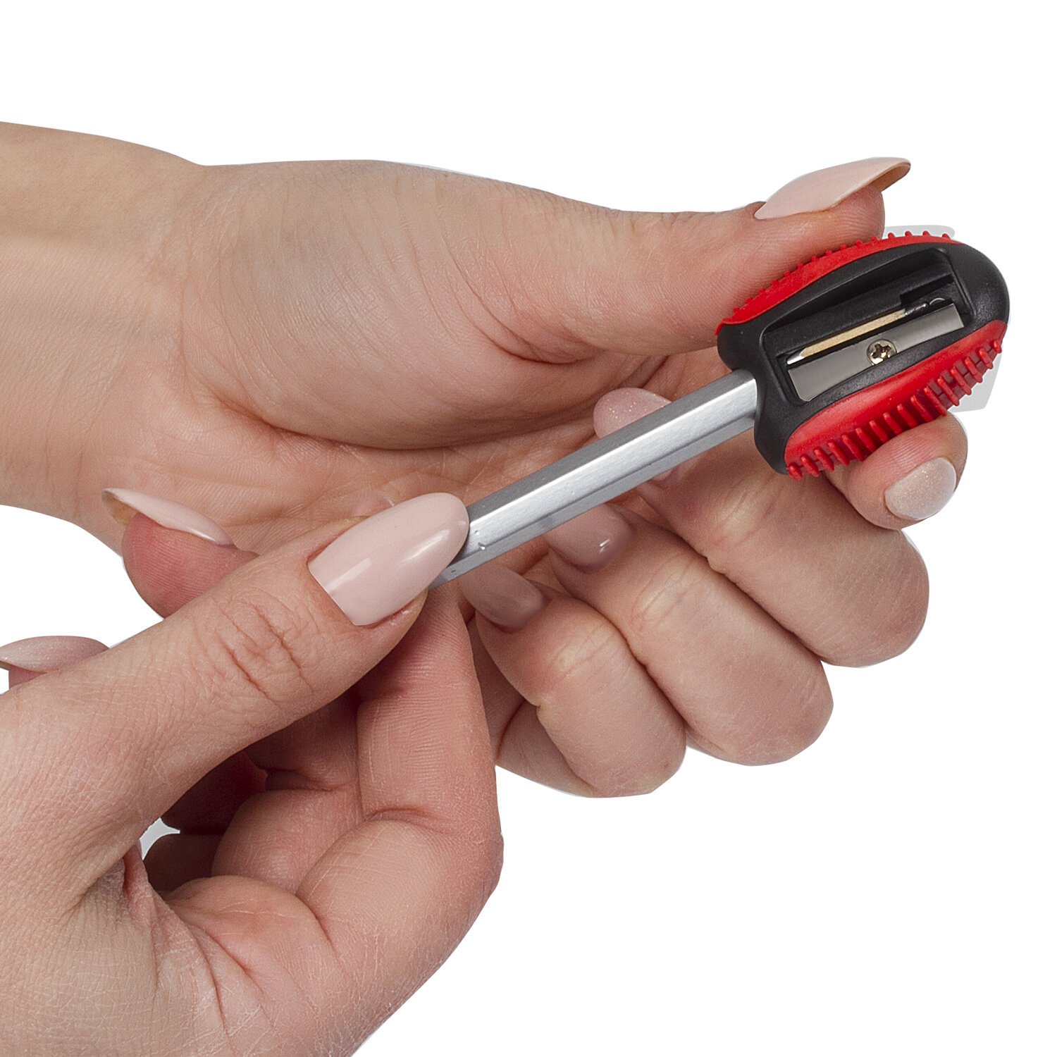 Эргономичный корпус выполнен из пластика с резиновыми вставками по бокам. Острое стальное лезвие обеспечивает быструю и легкую заточку. Карандаш затачивается аккуратно. Компактные размеры (16х25х37 мм) позволят поместить точилку в пенал, а благодаря интересной форме она не затеряется на парте или столе среди других принадлежностей.