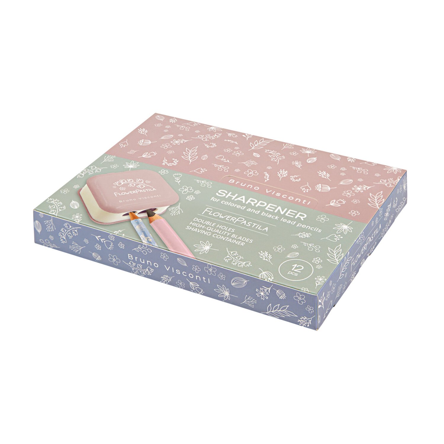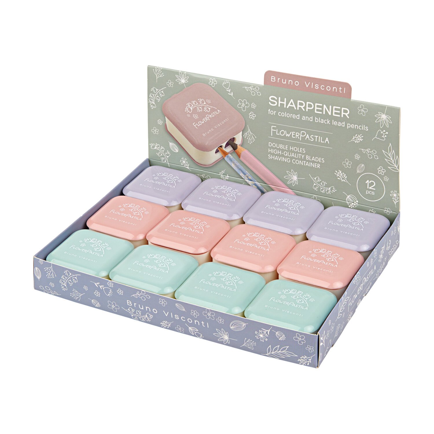 Универсальная точилка "FLOWER PASTILA" ТМ BRUNO VISCONTI для заточки чернографитовых и цветных карандашей стандартного размера и MAXI. Контейнер для стружки – удобно и практично. Лезвие из нержавеющей стали гарантирует легкую и результативную заточку. удобный размер 45х45х25мм.