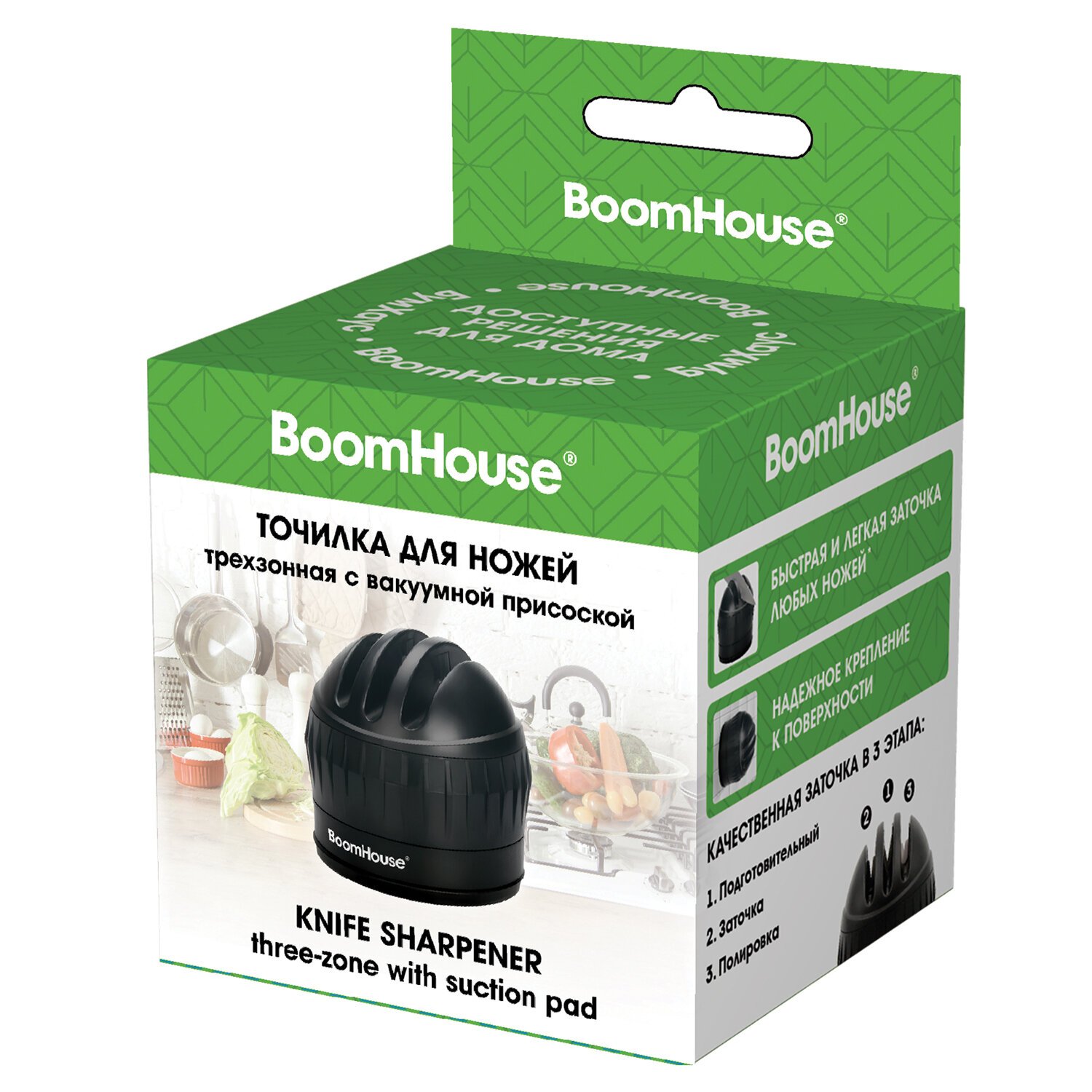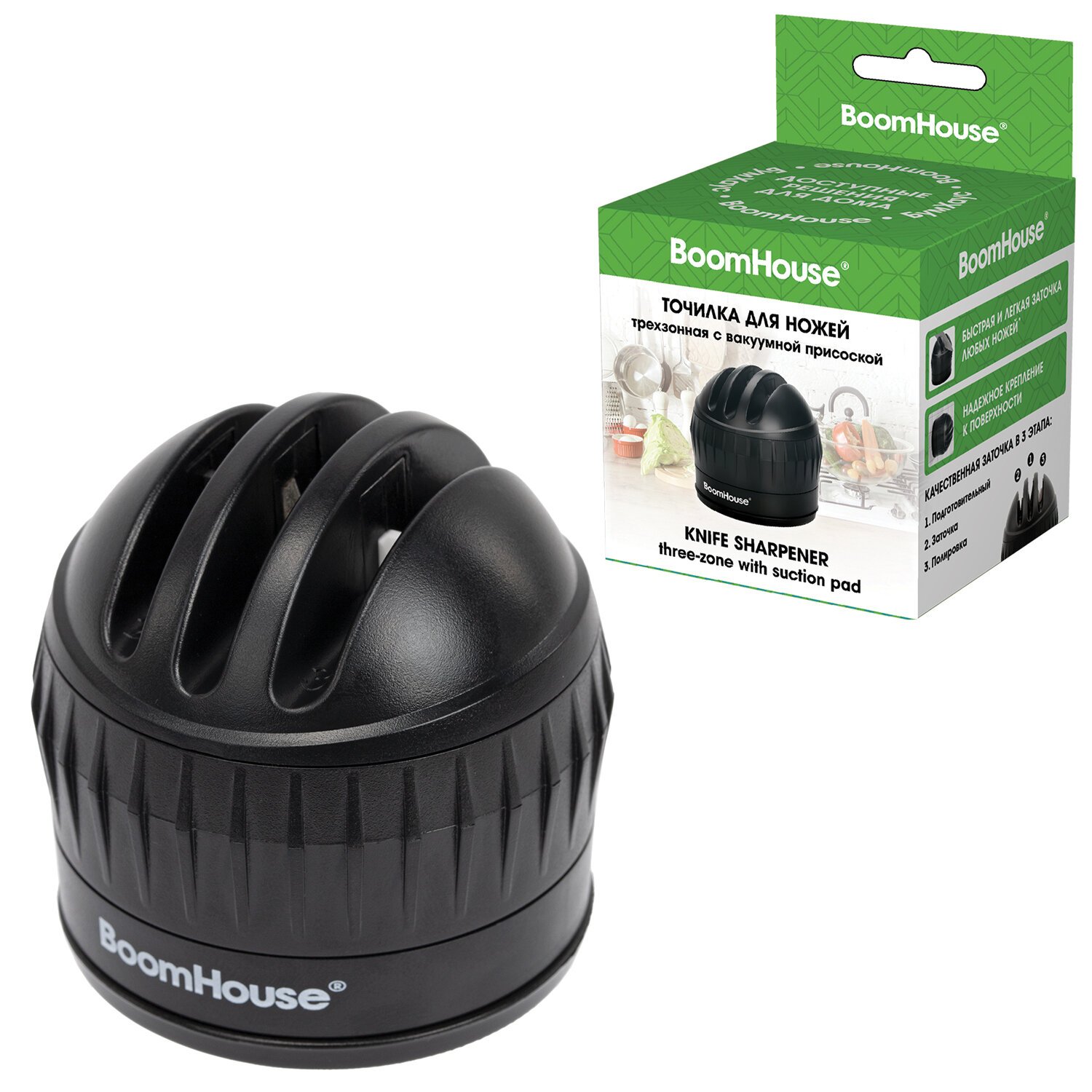 Точилка для ножей BoomHouse на присоске — это универсальный и компактный инструмент, который подходит для заточки самых разных лезвий. Острый нож — всего за пару секунд без лишних хлопот с точилкой BoomHouse.
