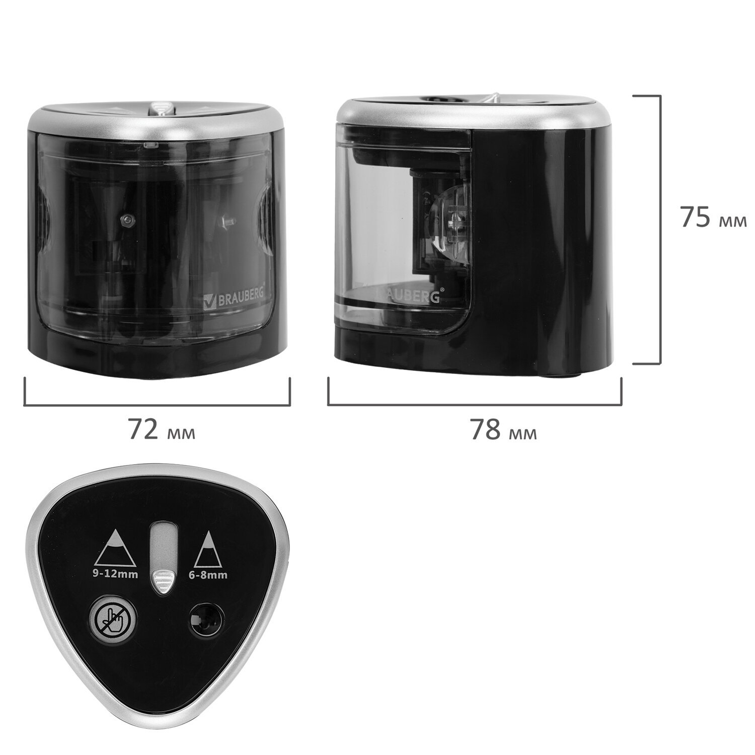 Электрическая точилка BRAUBERG DUAL со съемным контейнером для сбора мусора и прямым лезвием работает от 4 батареек АА (в комплект не входят). Имеет два отверстия для затачивания деревянных и пластиковых карандашей диаметром 6-8 мм и 9-12 мм.