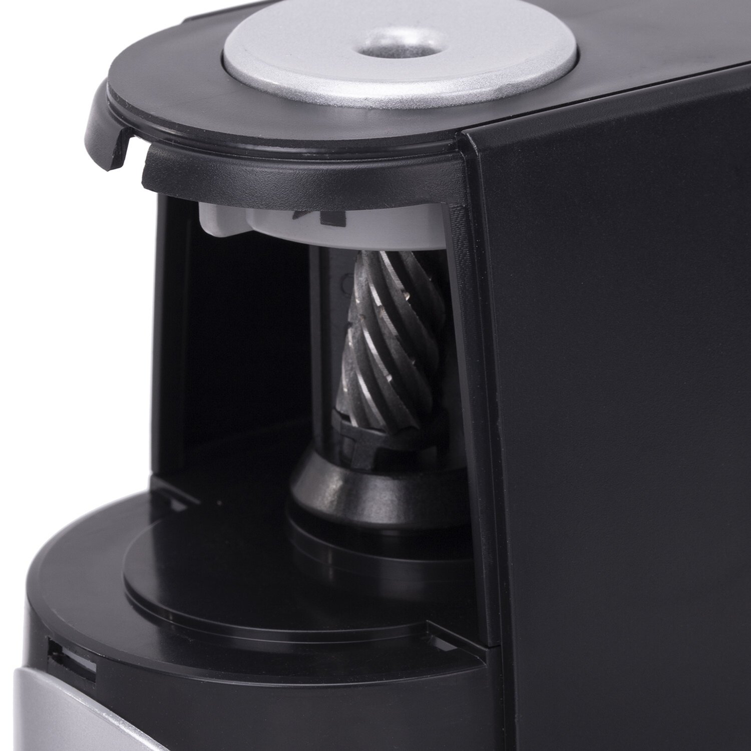 Стильный корпус точилки, выполненный из ударопрочного пластика, позволит ей стать интересной деталью любого интерьера, а прочное спиралевидное лезвие осуществляет острую и быструю заточку любых деревянных и пластиковых карандашей диаметром 6-8 мм. Автоматическая остановка заточки (автостоп) является неоспоримым преимуществом данной точилки. Точилка сама остановится, когда карандаш будет полностью заточен. Это позволит экономно стачивать карандаш, а также экономить ресурс батареек. Подходит как для чернографитных, так и для цветных карандашей. Имеет противоскользящее основание. Механизм приходит в движение при помощи электричества от 4 батареек АА (в комплект не входят). Затачивание начинается автоматически после помещения карандаша внутрь точилки, и через несколько секунд карандаш идеально заточен и готов к использованию.