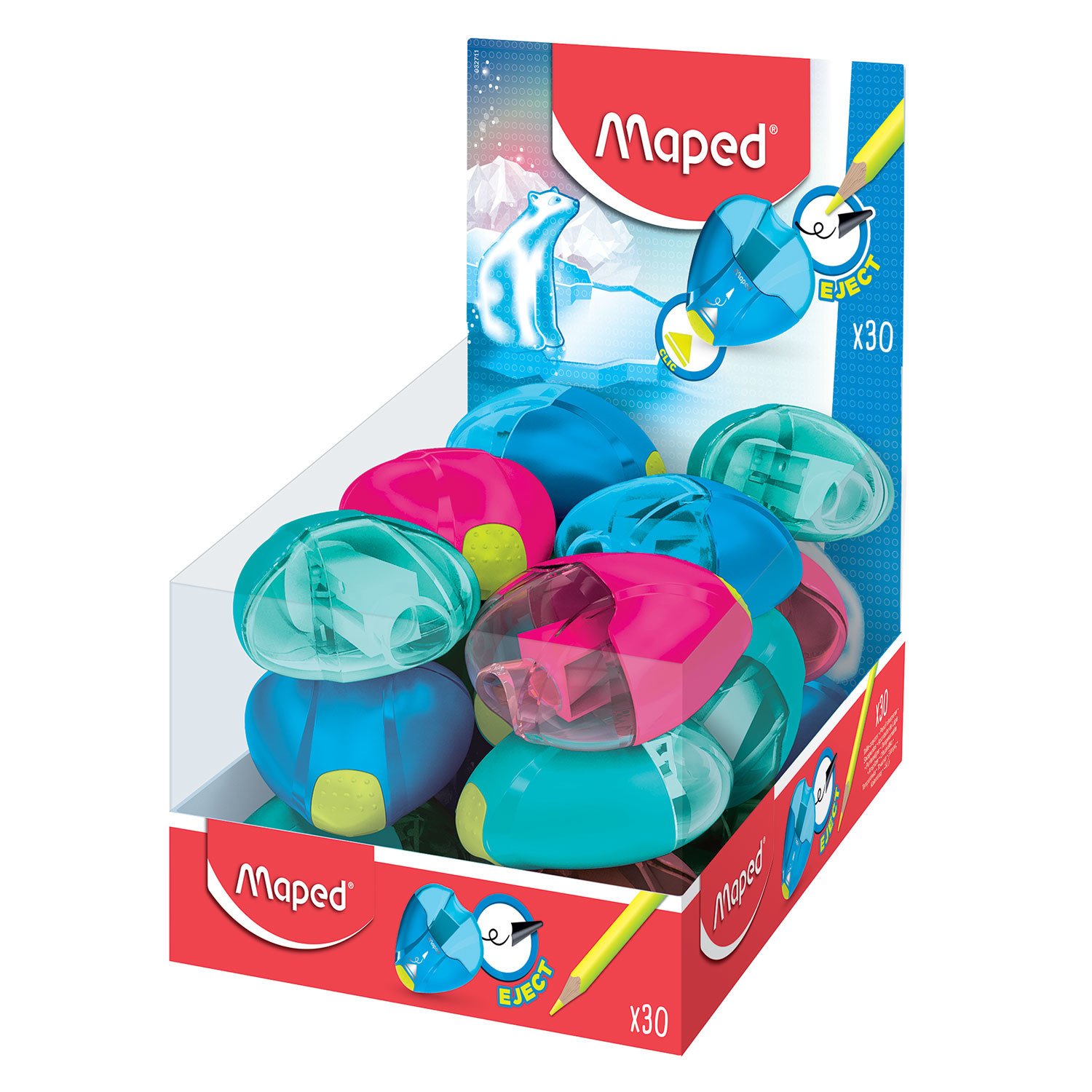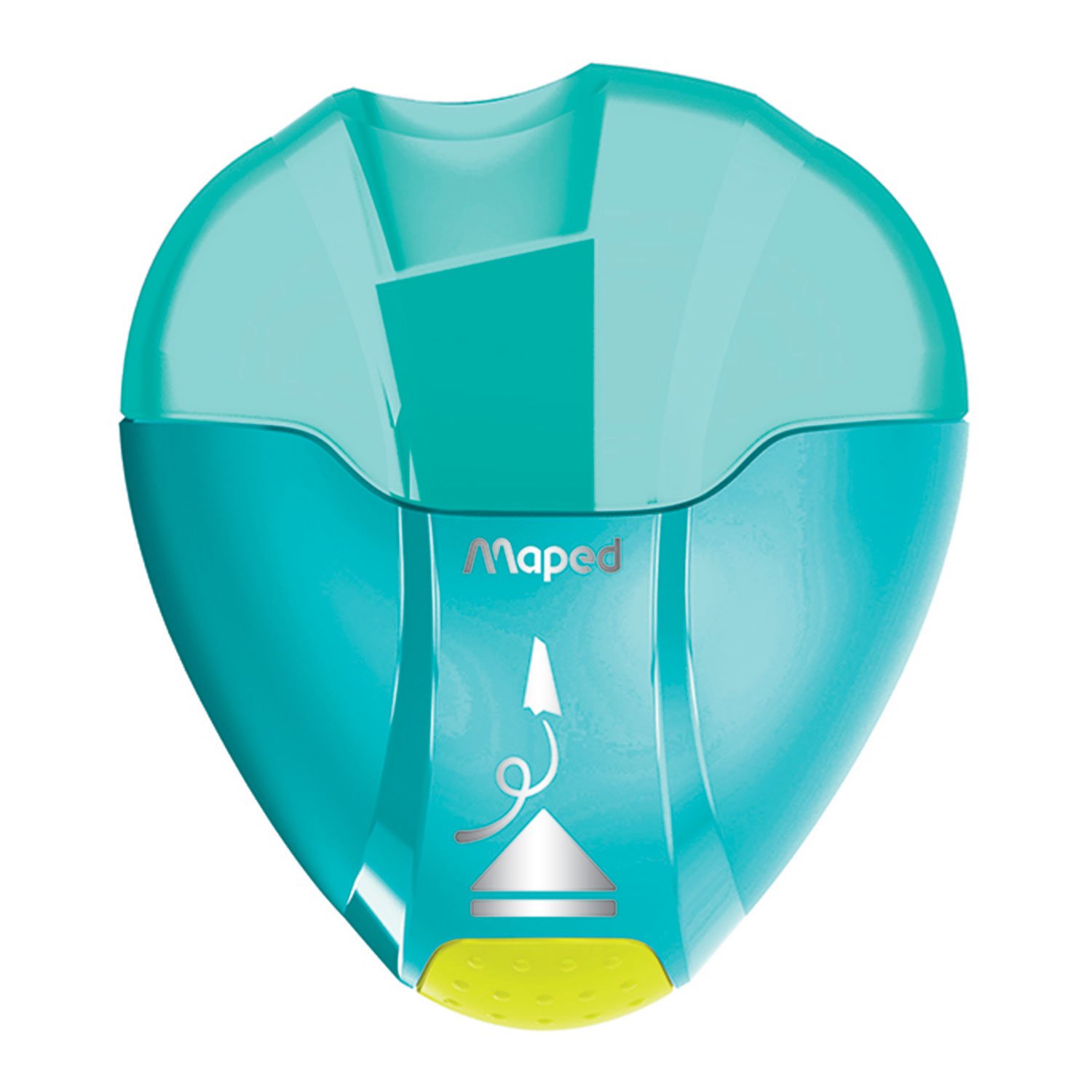 Высококачественная точилка MAPED "I-Gloo Eject" для заточки чернографитных карандашей с технологией Eject: сломанный грифель с лёгкостью удаляется из точилки одним нажатием на кнопку.