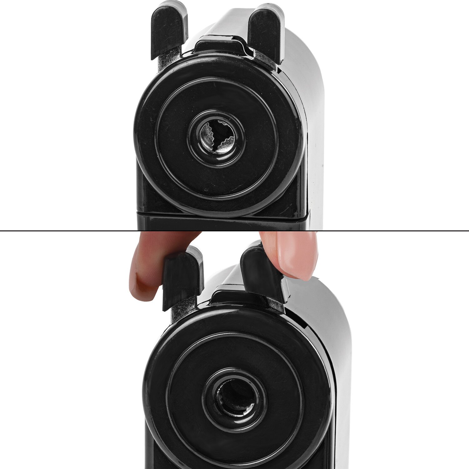 Корпус точилки выполнен из пластика черного цвета. Вращающийся роликовый нож из высококачественной стали обеспечивает быструю и острую заточку. Точилка имеет одно отверстие и вместительный контейнер для сбора стружки. Диаметр затачиваемого карандаша - 8 мм. Размер: 95х45х90 мм.