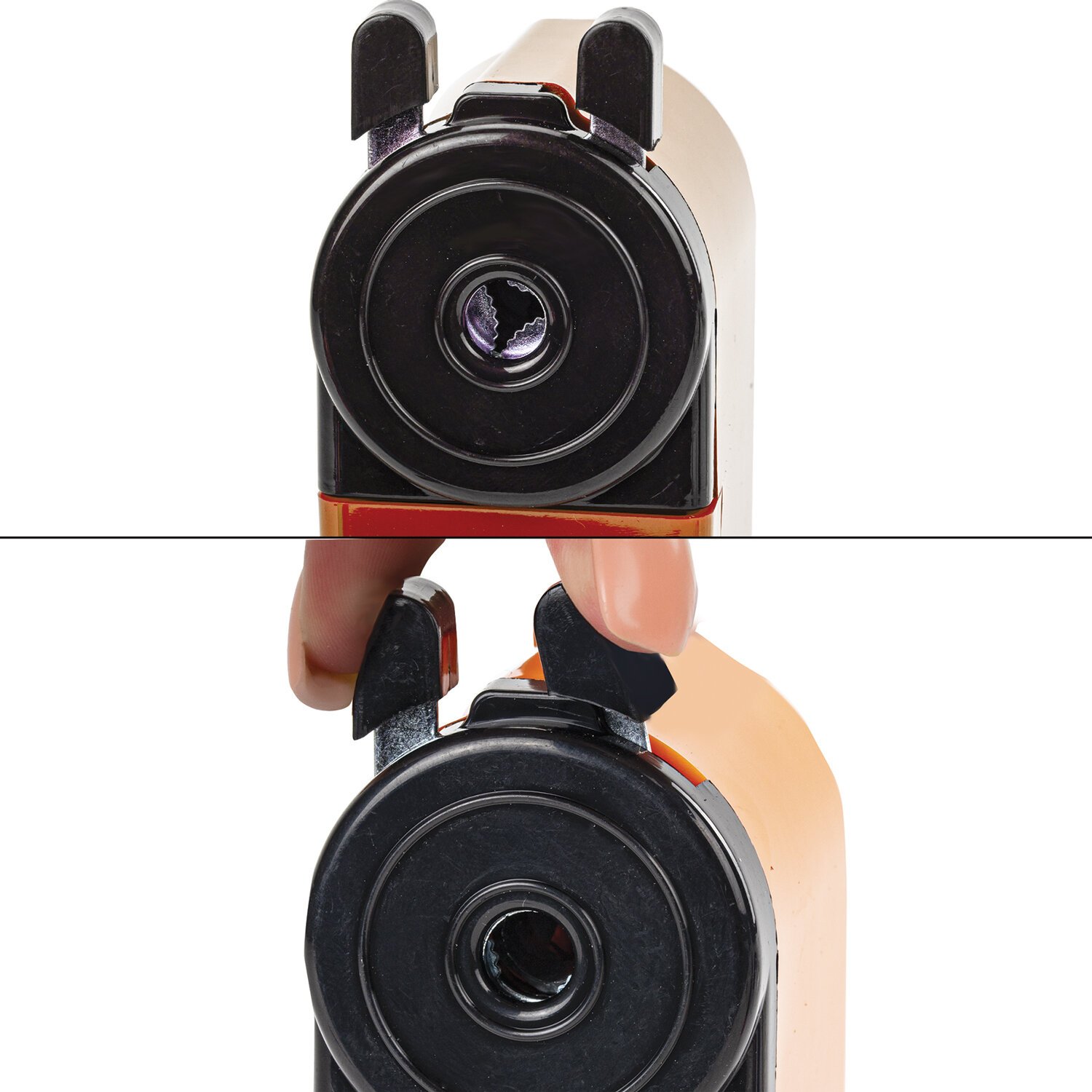 Корпус точилки выполнен из пластика оранжевого цвета. Вращающийся роликовый нож из высококачественной стали обеспечивает быструю и острую заточку. Точилка имеет одно отверстие и вместительный контейнер для сбора стружки. Диаметр затачиваемого карандаша - 8 мм. Размер: 95х45х90 мм.