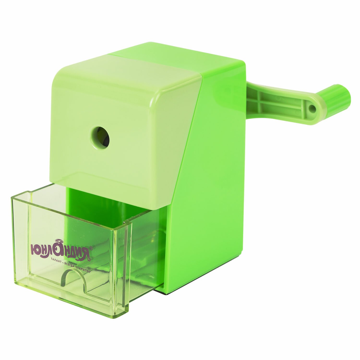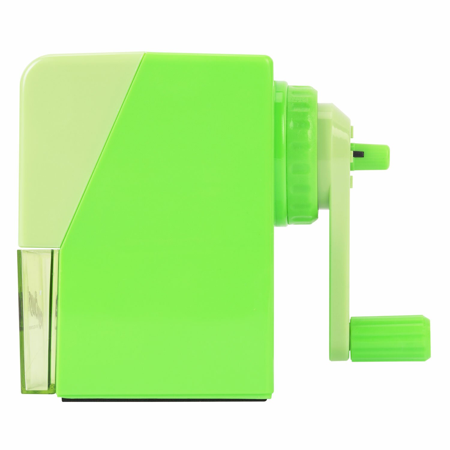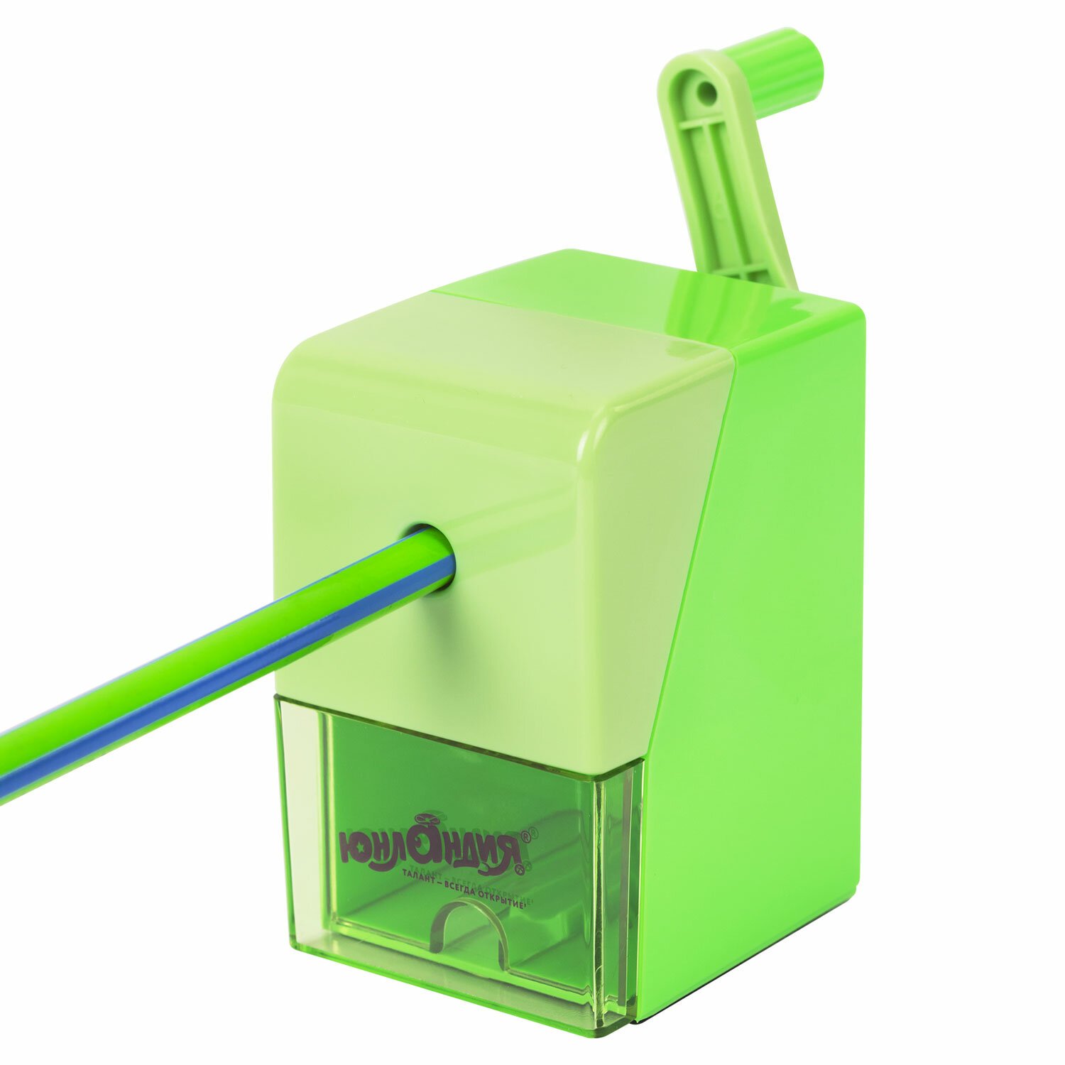 Корпус точилки выполнен из пластика в двух оттенках зелёного цвета. Вращающийся роликовый нож из высококачественной стали обеспечивает быструю и острую заточку. Струбцина позволит надежно зафиксировать точилку на поверхности рабочего стола. Точилка имеет одно отверстие и вместительный контейнер для сбора стружки. Диаметр затачиваемого карандаша - 8 мм. Размер - 96х81х51 мм.