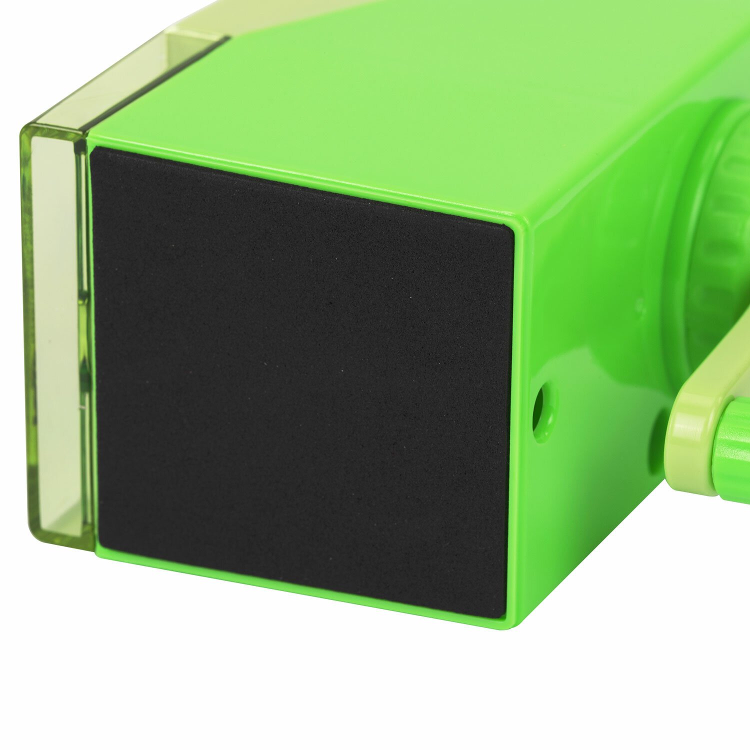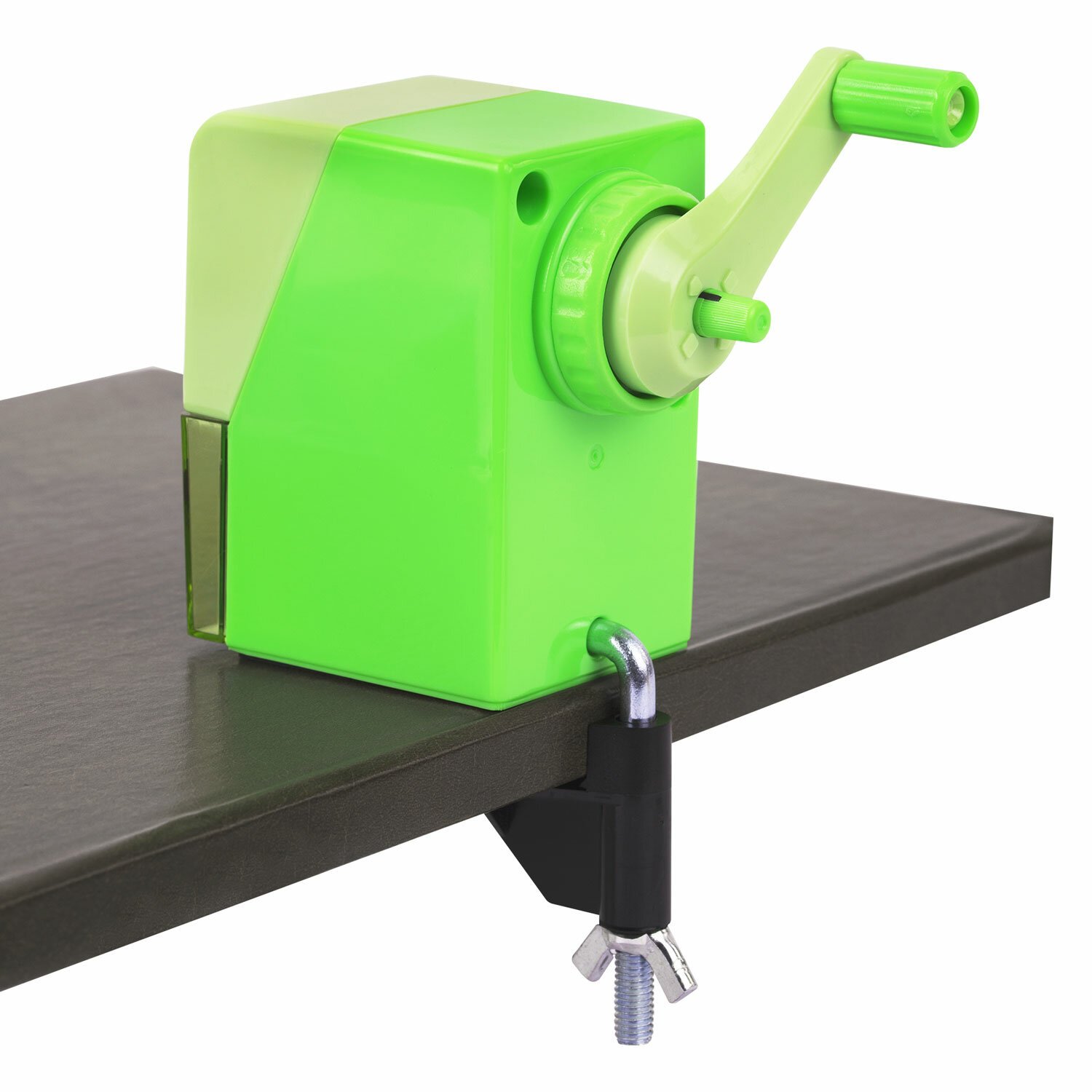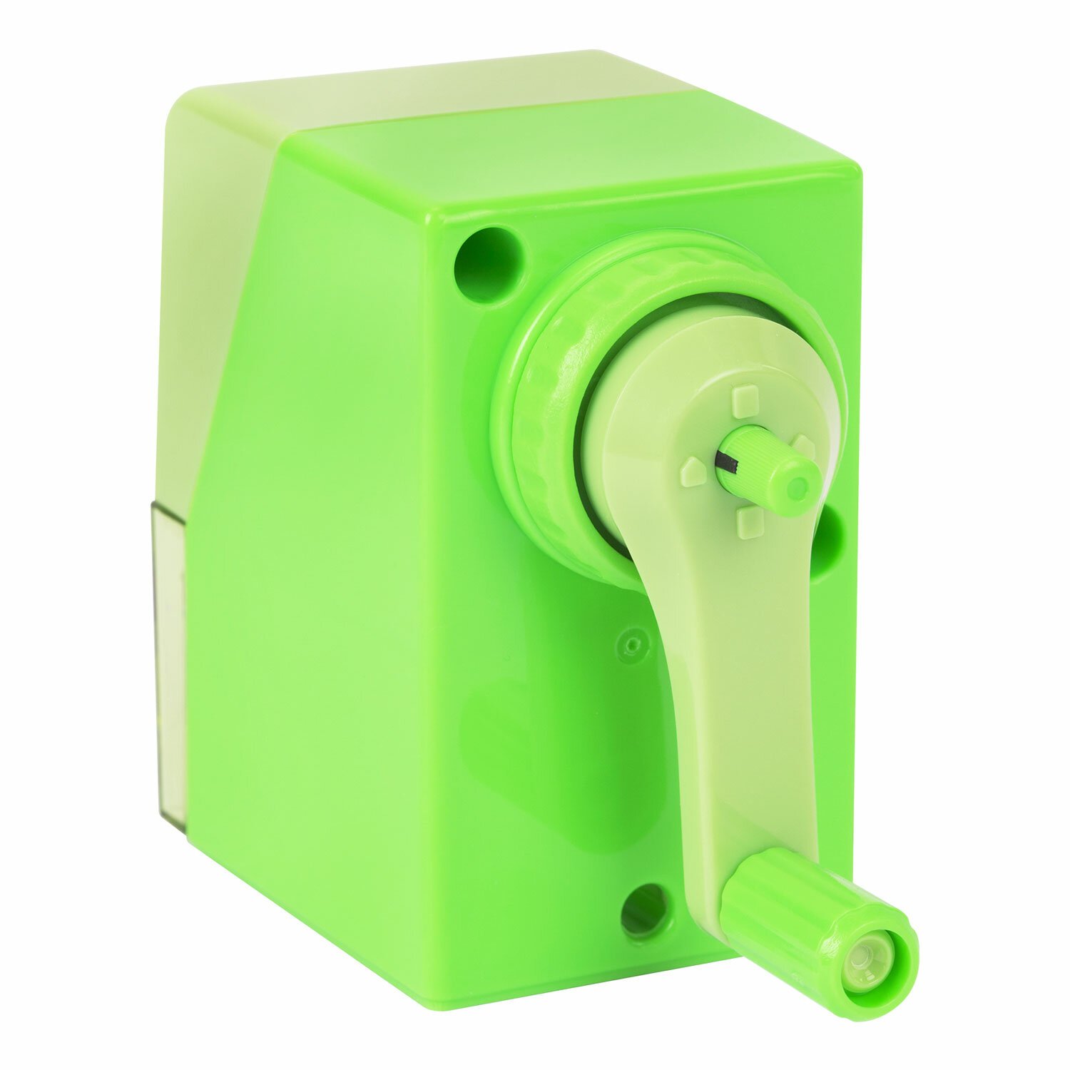Корпус точилки выполнен из пластика в двух оттенках зелёного цвета. Вращающийся роликовый нож из высококачественной стали обеспечивает быструю и острую заточку. Струбцина позволит надежно зафиксировать точилку на поверхности рабочего стола. Точилка имеет одно отверстие и вместительный контейнер для сбора стружки. Диаметр затачиваемого карандаша - 8 мм. Размер - 96х81х51 мм.