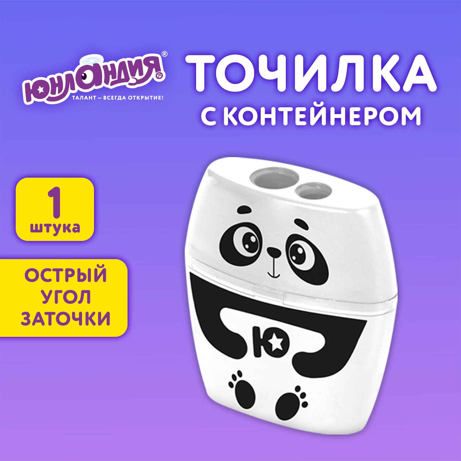 Точилка с контейнером для простых и утолщенных карандашей ЮНЛАНДИЯ "ПАНДА", 2 отверстия, 272507