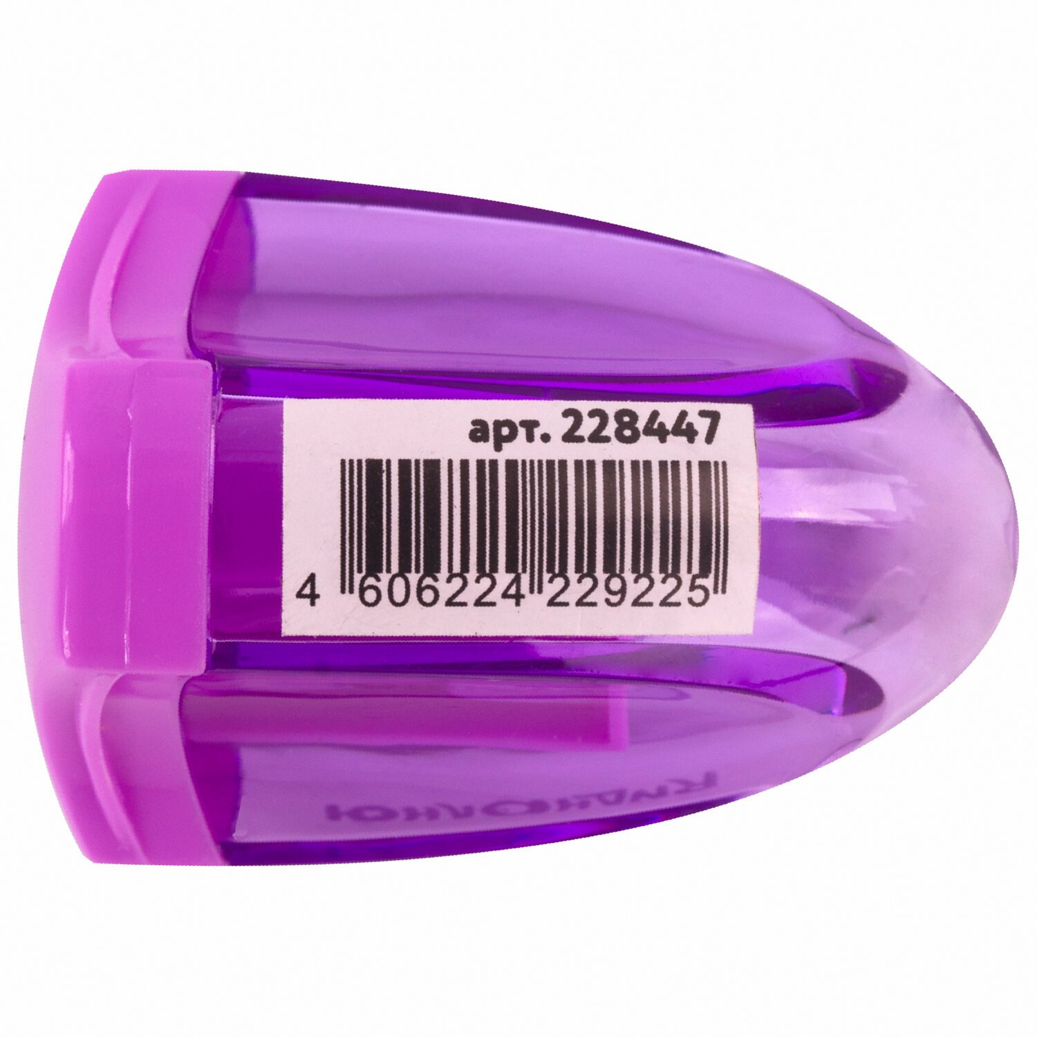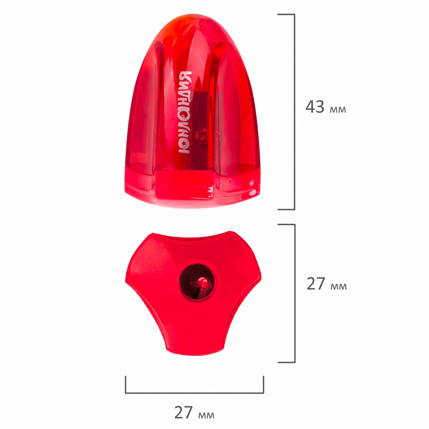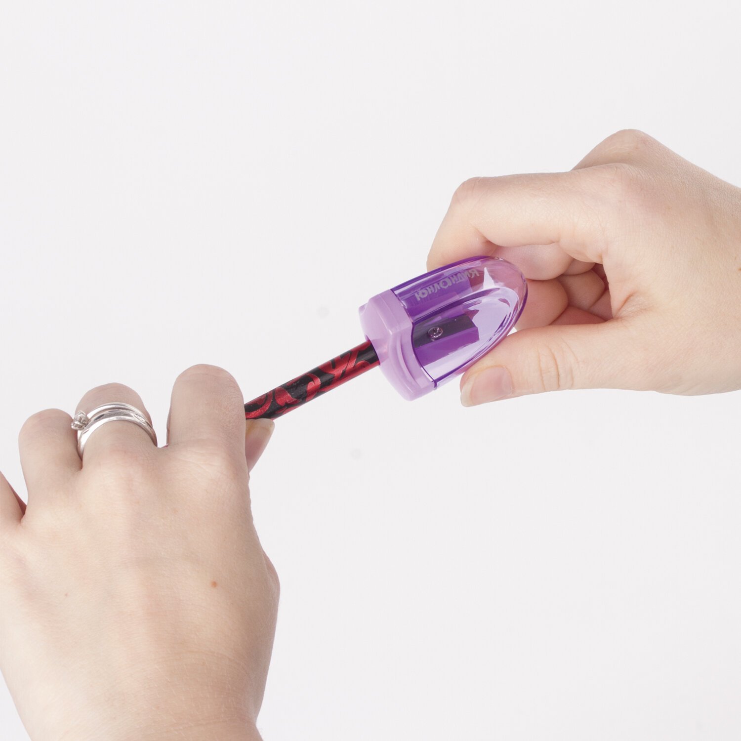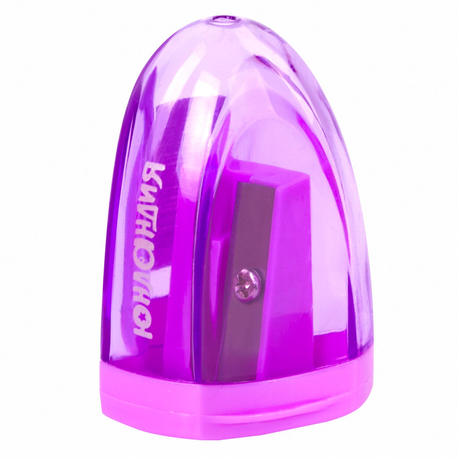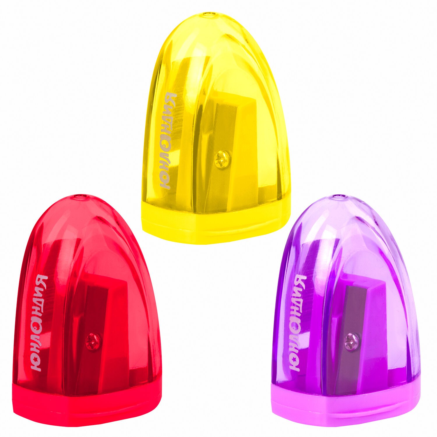 Корпус выполнен из пластика. Острое лезвие обеспечивает высококачественную и точную заточку. Карандаш до 8 мм затачивается легко и аккуратно, а опилки остаются в специальном контейнере. Компактные размеры (43х27х27 мм) позволят поместить точилку в пенал, а благодаря интересной форме она не затеряется на парте или столе среди других принадлежностей.
