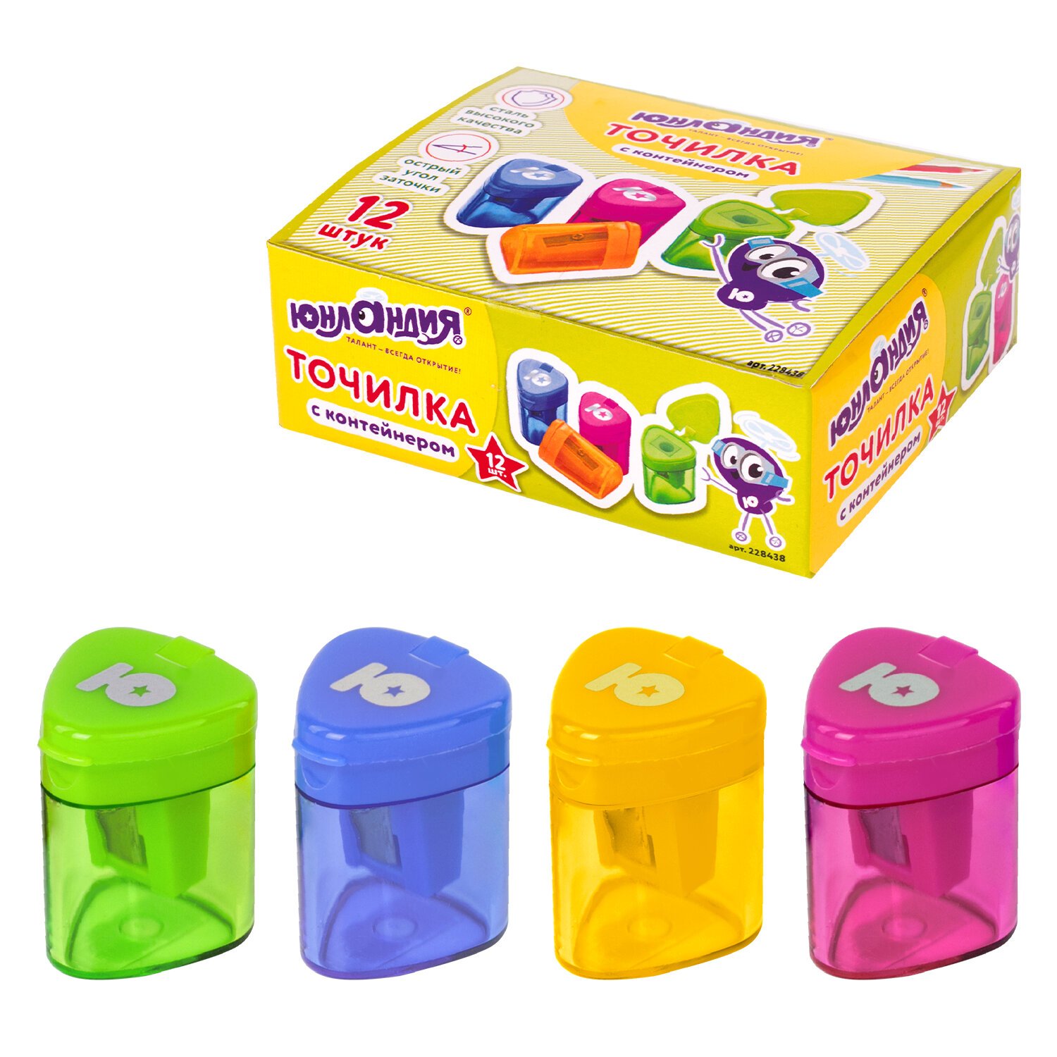 Точилка ЮНЛАНДИЯ "Трио", с контейнером, пластиковая, корпус ассорти, 228438