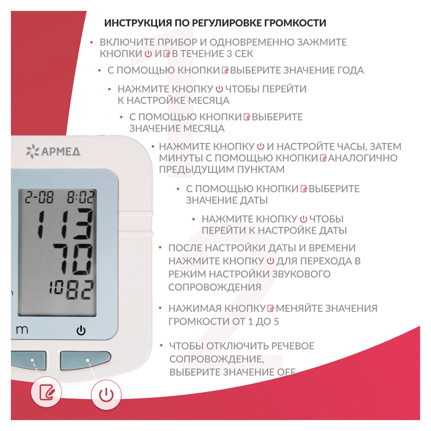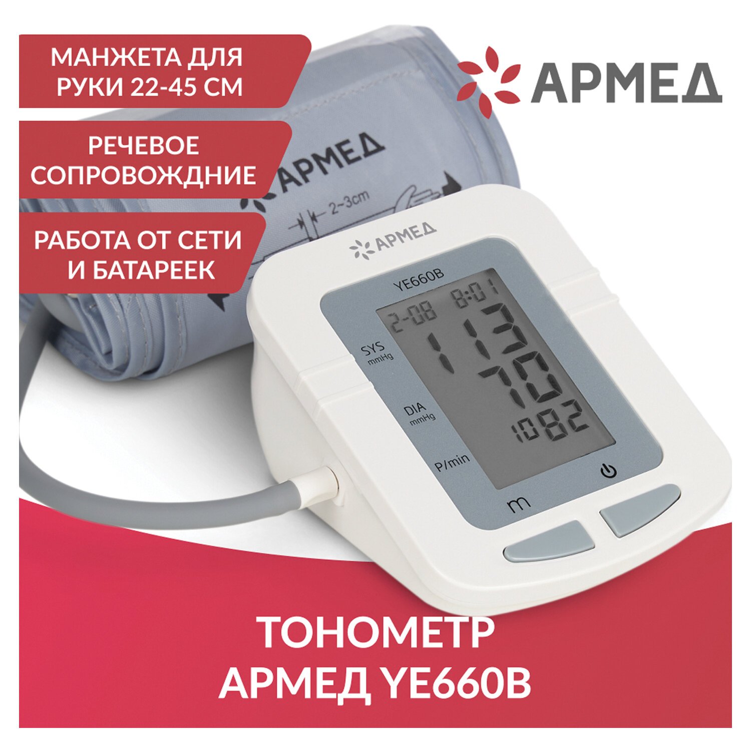 Тонометр электронного типа АРМЕД YE660B с речевым сопровождением быстро и точно измеряет СИС. и ДИАСТ. давление, пульс, ритм сердца. Компактный тонометр не занимает много места, поэтому устройство удобно брать в дорогу.