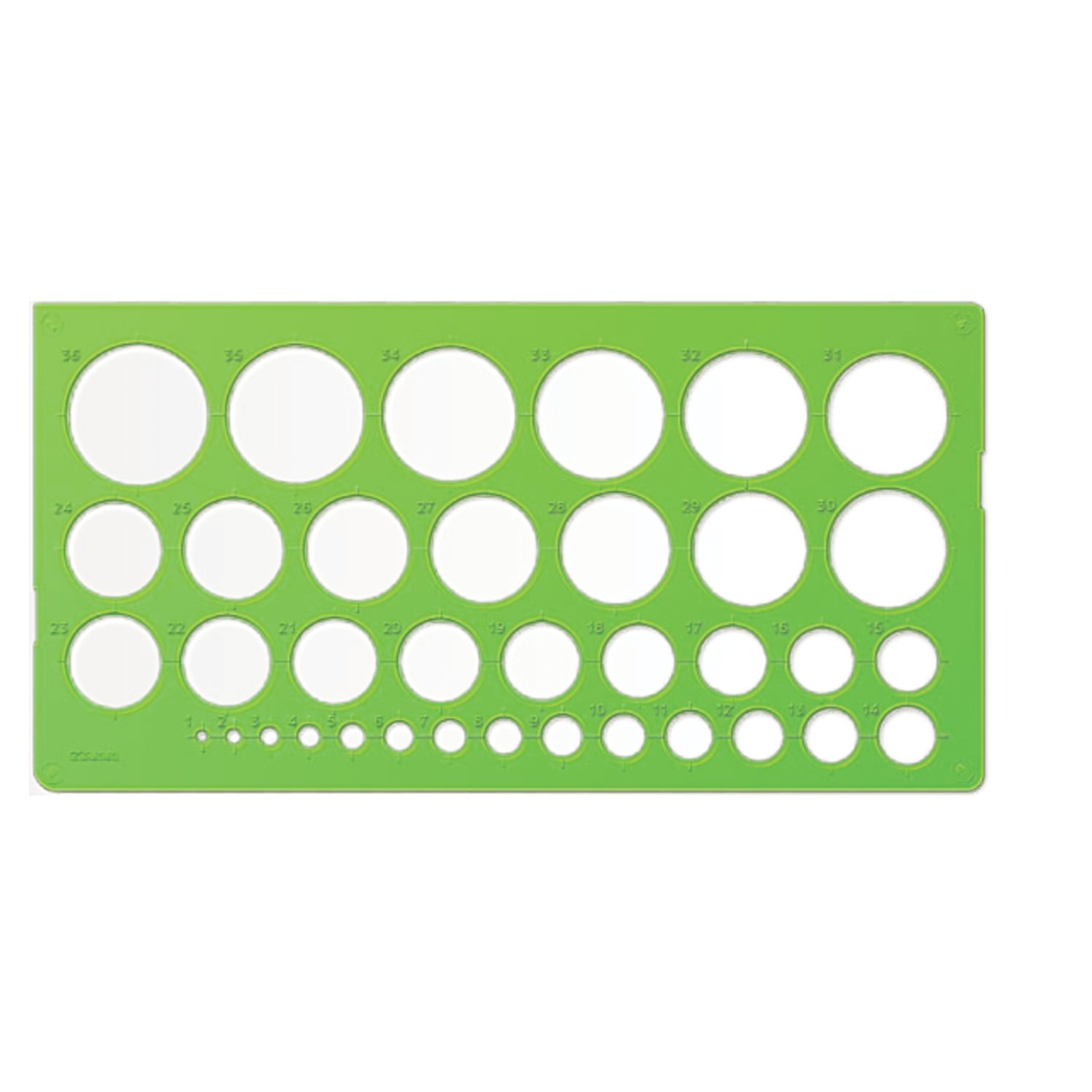 Прочный и удобный в использовании трафарет, который пригодится на занятиях дома, в детском саду, в школе, институте. Содержит 36 видов окружностей диаметром от 1 до 36 мм. Материал полистирол.