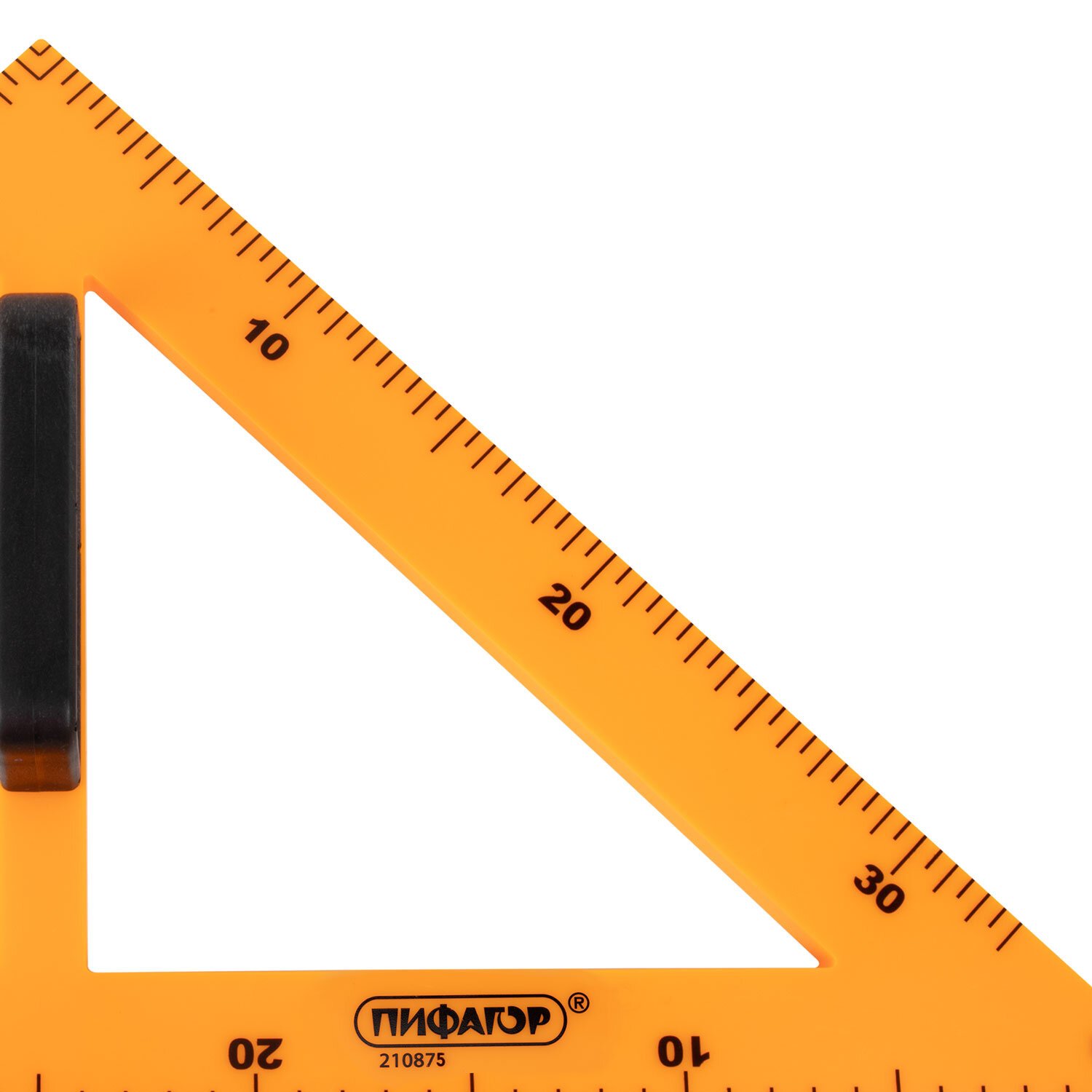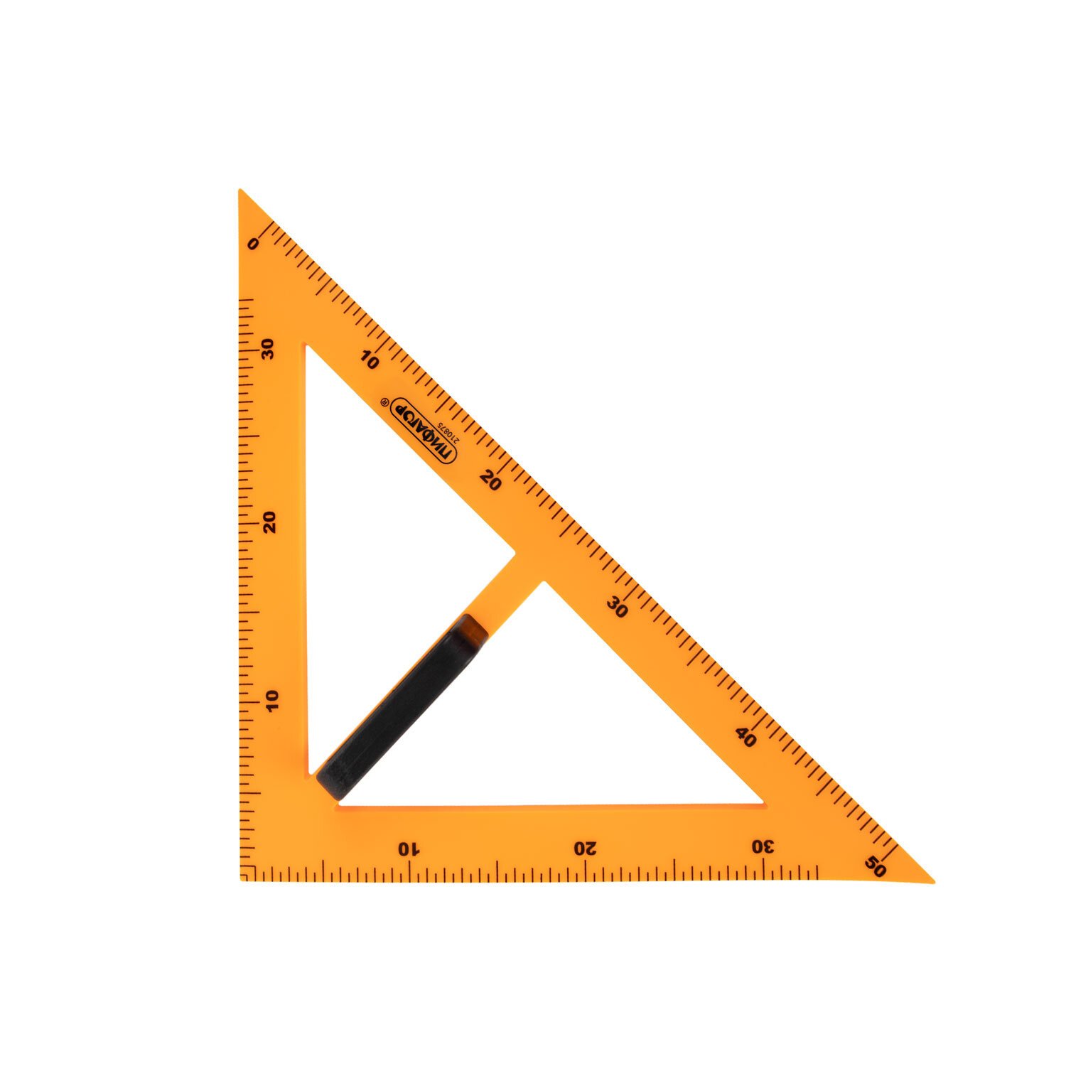 Изготовлен из прочного пластика. Длина шкалы - 50 см, углы - 45° и 90°. Обладает четкой контрастной печатной разметкой. Цвет треугольника - оранжевый. Упакован в воздушно-пузырчатую пленку.