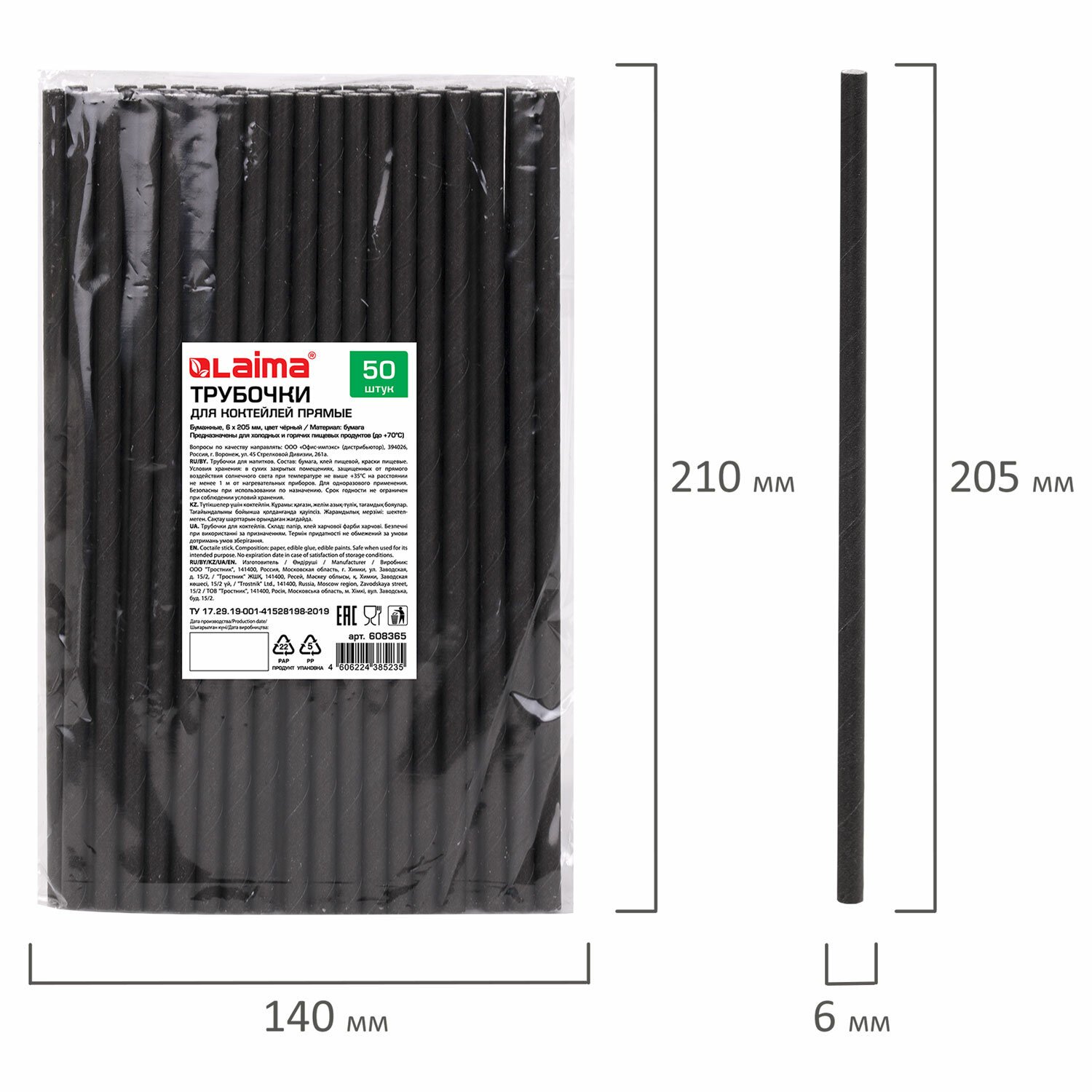 Трубочки для коктейлей бумажные, прямые, 6х205 мм, черные, комплект 50 штук, LAIMA, 608365