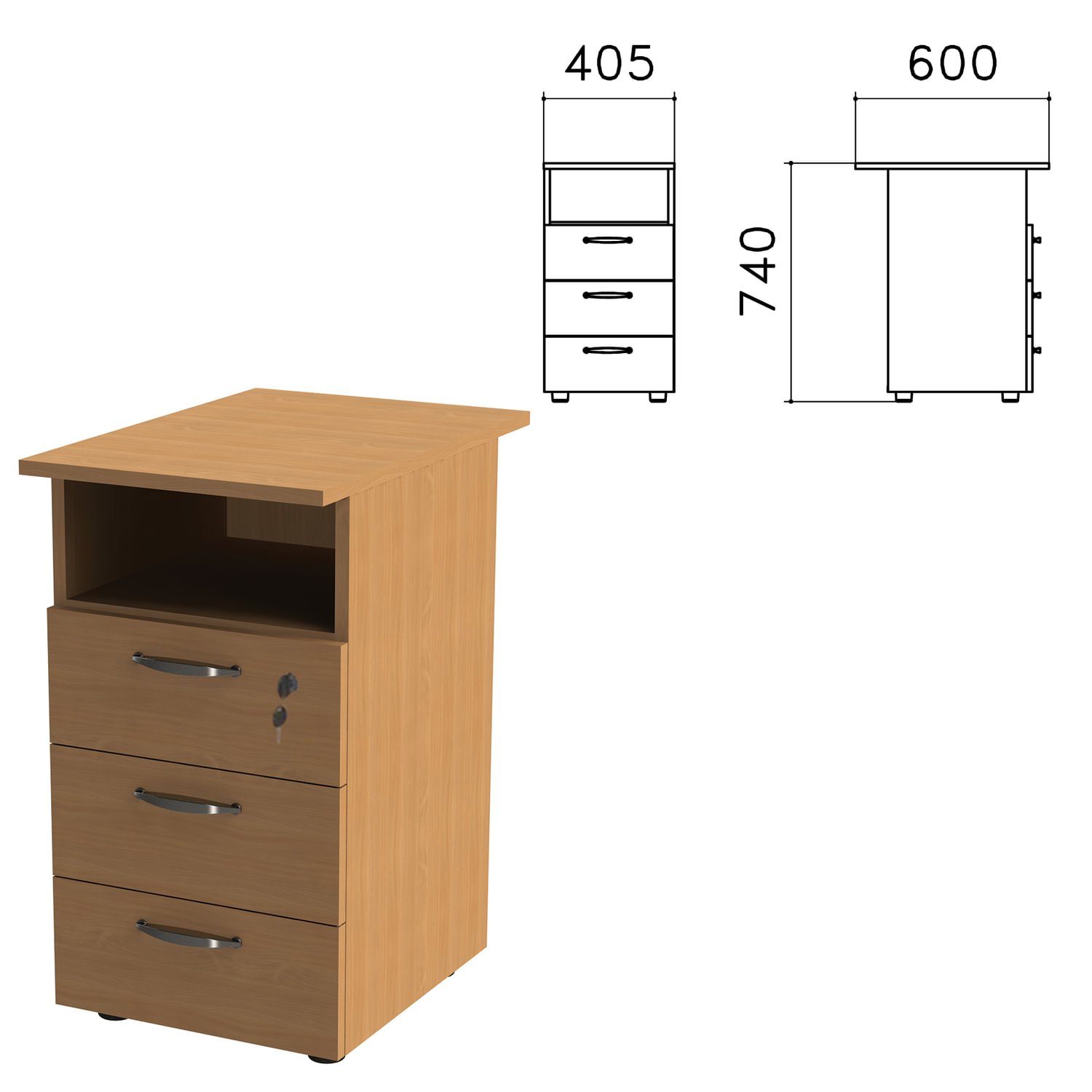 Тумба приставная "Эко", 405х600х740 мм, 3 ящика, полка, замок, бук бавария, 402787-55