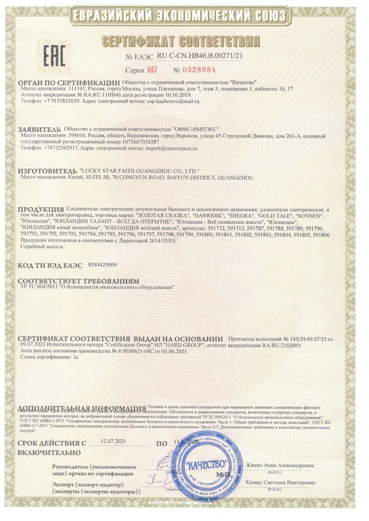 Электрический удлинитель представляет собой медный провод, помещенный в термическую усадочную трубку из поливинилхлорида, оснащенную штепсельной вилкой с одного конца провода и штепсельной розеткой – с другой. Тип используемой штепсельной вилки для соединения с источником питания – europlug (CEE 7/4). Данный тип вилки рассчитан на напряжение до 230 В и ток силой до 16 А. Длина провода – 3 м. Удлинитель предназначен для подключения электрогирлянд в местах, удалённых от стационарных розеток, и только внутри помещений.