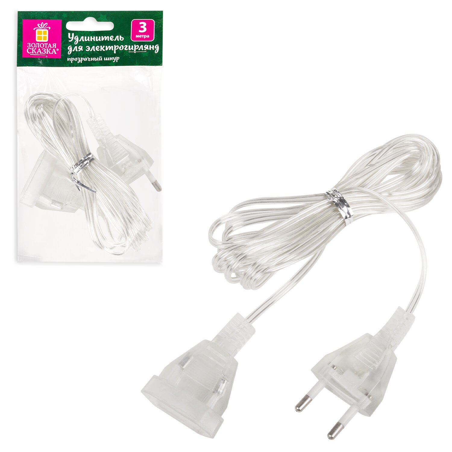 Удлинитель для электрогирлянд 3 м, прозрачный шнур, пакет, ЗОЛОТАЯ СКАЗКА, 591712