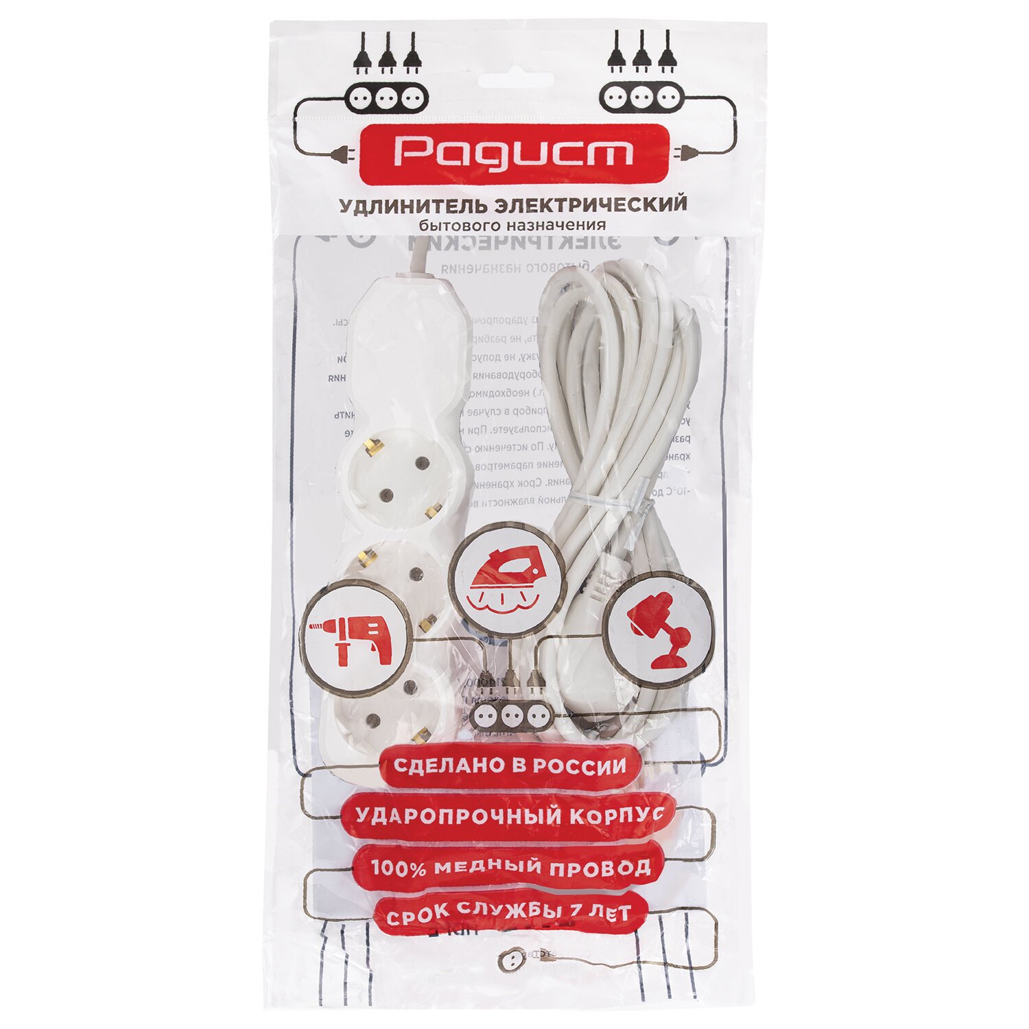 Удлинитель подходит для использования дома, в офисе или на даче. Он предназначен для подключения самых разных электроприборов: от бытовой техники до профессионального инструмента.